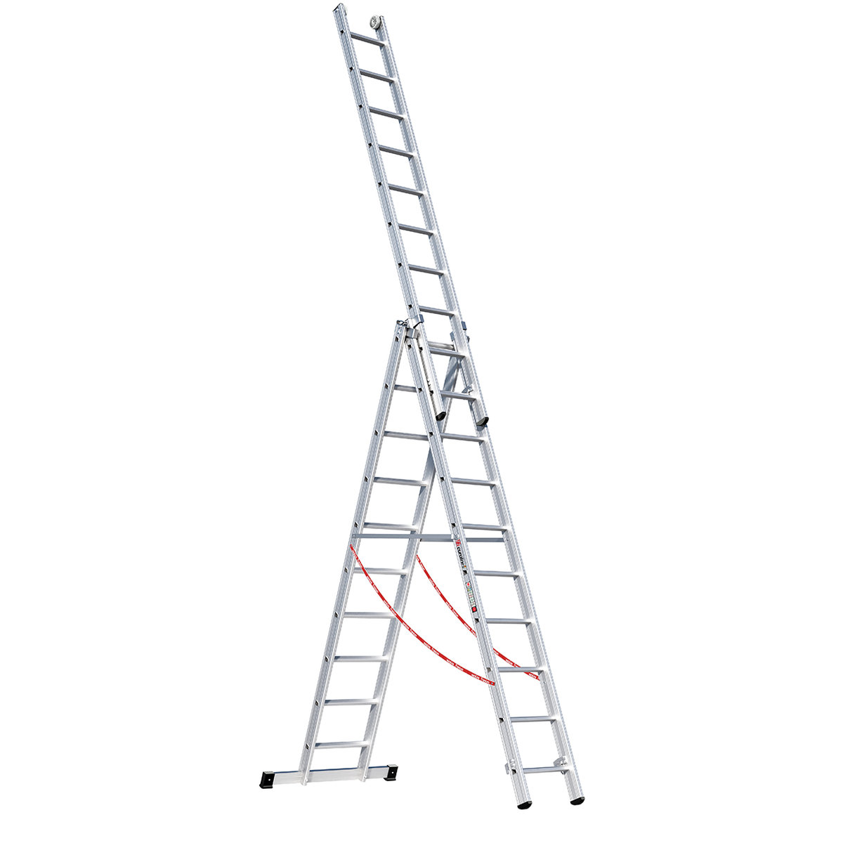 Eine Leiter – viele Einsatzmöglichkeiten: Als Anlegeleiter, Stehleiter und SchiebeleiterAlu-Mehrzweckleiter mit 3×10 Sprosseneuroline – der sichere AufstiegDiese 3-teilige Mehrzweckleiter ist aufgrund Ihrer vielfältigen Nutzungsmöglichkeiten als Anlegeleiter, Schiebeleiter als auch einfache Stehleiter oder auch Stehleiter mit Aufsteckteil für den Profi-Einsatz in nahezu jedem Innen- und Außenbereich einsetzbar. Ob bei Reparaturen, Reinigungs- oder Handwerksarbeiten: erhältlich in 8 verschiedenen Größen und mit einer stabilen Quertraverse versehen, bildet diese Leiter die ideale Steighilfe für das Arbeiten in den verschiedenen Höhen. Durch das leichte Gewicht ist Sie auch in den größeren Größen noch leicht zu transportieren oder umzusetzen. Sprossen mit 32mm waagerechter Auftrittsfläche für sicheren und ermüdungsfreien Stand Sprossenabstand 280mm Breite Quertrav…
