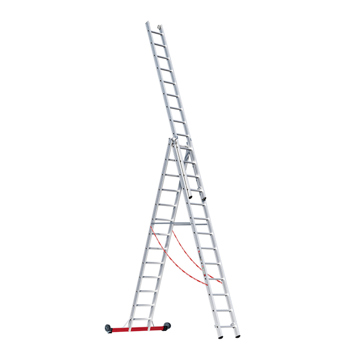 Eine Leiter – viele Einsatzmöglichkeiten: Als Anlegeleiter, Stehleiter und SchiebeleiterAlu-Mehrzweckleiter mit 3×13 Sprossen, rollbareuroline – der sichere AufstiegDiese 3-teilige Mehrzweckleiter ist aufgrund Ihrer vielfältigen Nutzungsmöglichkeiten als Anlegeleiter, Schiebeleiter als auch einfache Stehleiter oder auch Stehleiter mit Aufsteckteil für den Profi-Einsatz in nahezu jedem Innen- und Außenbereich einsetzbar. Ob bei Reparaturen, Reinigungs- oder Handwerksarbeiten: erhältlich in 8 verschiedenen Größen und mit einer stabilen, rollbaren Quertraverse versehen, bildet diese Leiter die ideale Steighilfe für das Arbeiten in den verschiedenen Höhen. Durch das leichte Gewicht und der rollbaren Quertraverse ist Sie auch in den größeren Größen noch leicht zu transportieren oder umzusetzen. Sprossen mit 32mm waagerechter Auftrittsfläche für sicheren und ermüdungsfreien Stand …