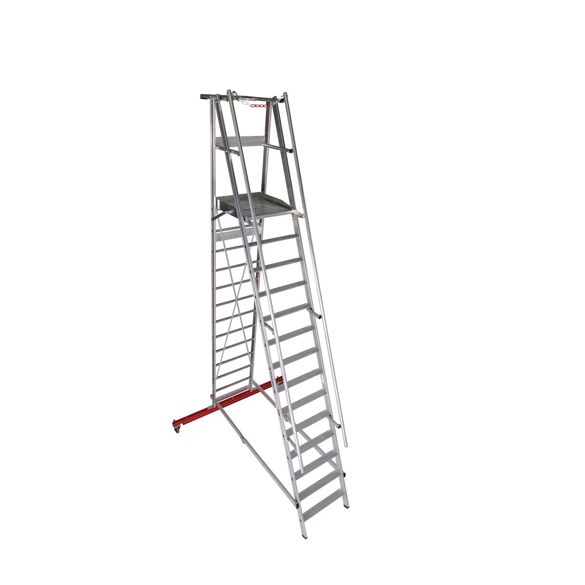 Alu-Podestleiter, fahr- und klappbar 32777 mit 14 Stufeneuroline – der sichere AufstiegDiese fahrbare und klappbare Podestleiter mit großer Arbeitsplattform kann eingesetzt werden um im Lager höhere Etagen zu erreichen oder um Reparaturarbeiten durchzuführen, die sehr lange dauern. Auf der großen Aluminiumplattform mit dreiseitigem Geländer ist längeres Stehen sicher und ermüdungsfrei möglich. In der großen Ablageschale können zum Beispiel Werkzeuge beim Arbeiten abgelegt werden. Durch die zwei Feststellrollen kann sie an der Aufstiegsseite angehoben und einfach verschoben werden. Wird die Leiter vorübergehend nicht gebraucht, kann sie durch das Zusammenklappen platzsparend verstaut werden. Durch die 80 mm tiefen geriffelten Stufen entspricht diese fahrbare Plattformleiter auch der neuen TRBS 2121-2 (Technische Regeln für Betriebssicherheit). Der beidseitige Handlauf erhöht zusätzlich…