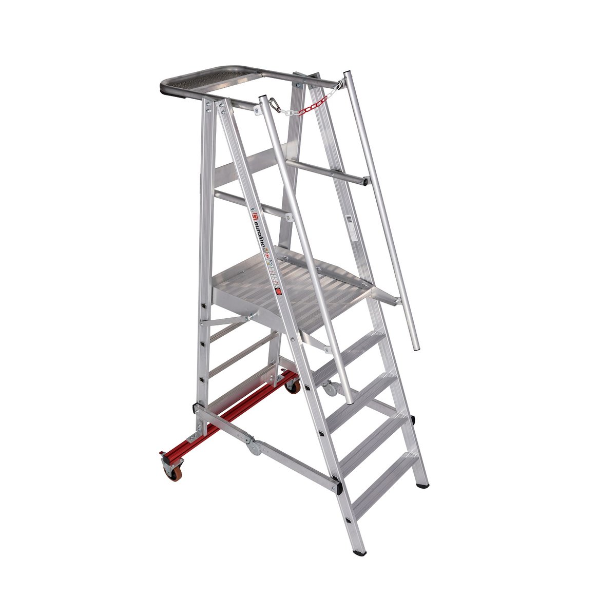 Alu-Podestleiter, fahr- und klappbar 32777 mit 5 Stufeneuroline – der sichere AufstiegDiese fahrbare und klappbare Podestleiter mit großer Arbeitsplattform kann eingesetzt werden um im Lager höhere Etagen zu erreichen oder um Reparaturarbeiten durchzuführen, die sehr lange dauern. Auf der großen Aluminiumplattform mit dreiseitigem Geländer ist längeres Stehen sicher und ermüdungsfrei möglich. In der großen Ablageschale können zum Beispiel Werkzeuge beim Arbeiten abgelegt werden. Durch die zwei Feststellrollen kann sie an der Aufstiegsseite angehoben und einfach verschoben werden. Wird die Leiter vorübergehend nicht gebraucht, kann sie durch das Zusammenklappen platzsparend verstaut werden. Durch die 80 mm tiefen geriffelten Stufen entspricht diese fahrbare Plattformleiter auch der neuen TRBS 2121-2 (Technische Regeln für Betriebssicherheit). Der beidseitige Handlauf erhöht zusätzlich …