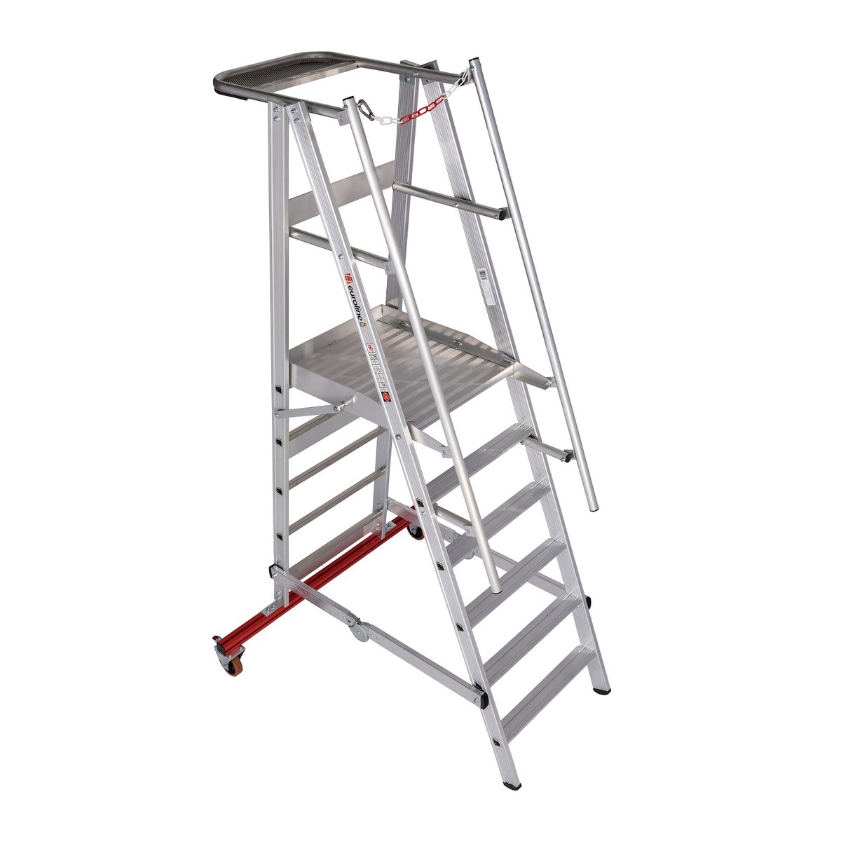 Alu-Podestleiter, fahr- und klappbar 32777 mit 6 Stufeneuroline – der sichere AufstiegDiese fahrbare und klappbare Podestleiter mit großer Arbeitsplattform kann eingesetzt werden um im Lager höhere Etagen zu erreichen oder um Reparaturarbeiten durchzuführen, die sehr lange dauern. Auf der großen Aluminiumplattform mit dreiseitigem Geländer ist längeres Stehen sicher und ermüdungsfrei möglich. In der großen Ablageschale können zum Beispiel Werkzeuge beim Arbeiten abgelegt werden. Durch die zwei Feststellrollen kann sie an der Aufstiegsseite angehoben und einfach verschoben werden. Wird die Leiter vorübergehend nicht gebraucht, kann sie durch das Zusammenklappen platzsparend verstaut werden. Durch die 80 mm tiefen geriffelten Stufen entspricht diese fahrbare Plattformleiter auch der neuen TRBS 2121-2 (Technische Regeln für Betriebssicherheit). Der beidseitige Handlauf erhöht zusätzlich …