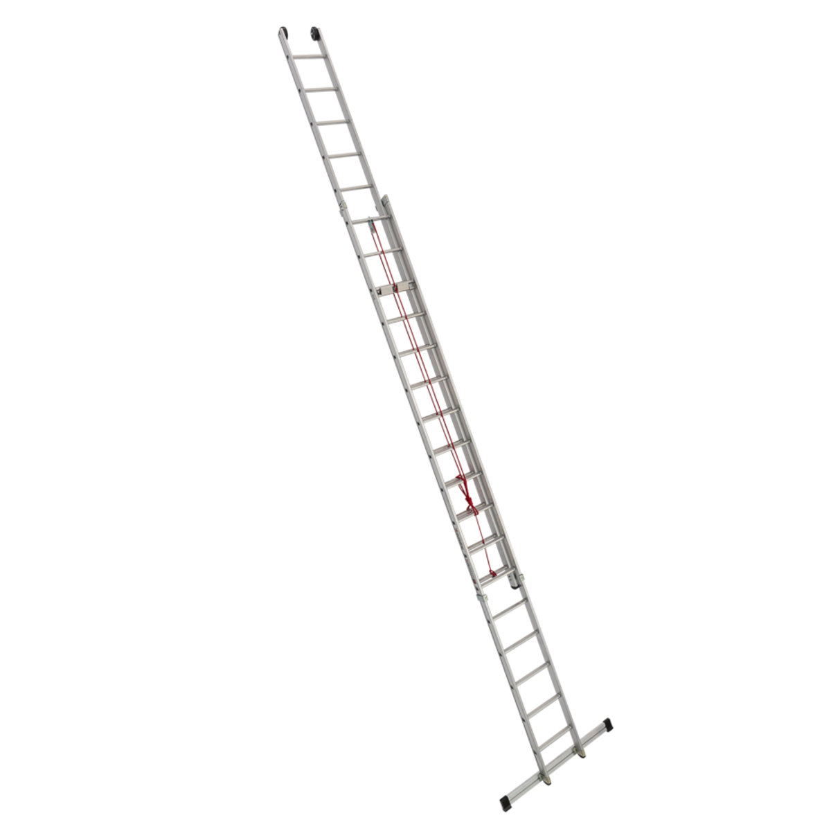 Alu-Seilzugleiter 2-teilig mit 2×17 Sprosseneuroline – der sichere AufstiegDiese Seilzugleiter ist eine der besten Lösungen für jeden, der sehr hoch hinaus will. Besonders Handwerker wie Dachdecker, Elektriker oder Hausmeister arbeiten gerne mit dieser Art von Leitern an hohen Gebäuden oder Baustellen. Obwohl sie sehr lang ist, lässt sie sich mit dem Seil, ganz einfach von einer Person ohne großen Kraftaufwand nach oben ausziehen. Wenn an Wänden gearbeitet werden soll, erleichtern die Wandlaufrollen zusätzlich das Ausziehen der 2-teiligen Anlegeleiter und schonen gleichzeitig die Wand vor Beschädigungen. Fallhaken sorgen für schnelles und einfaches Feststellen an jeder Sprosse. Sprossenabstand 280 mm Breite Quertraverse für sicheren StandVon Sprossen zu Sprosse mit Seil (Ø 12 mm) ausziehbarVollflächig aufliegender FallhakenWaagerechte Auftrittsfläche für sicheren und ermüdungsfreien S…