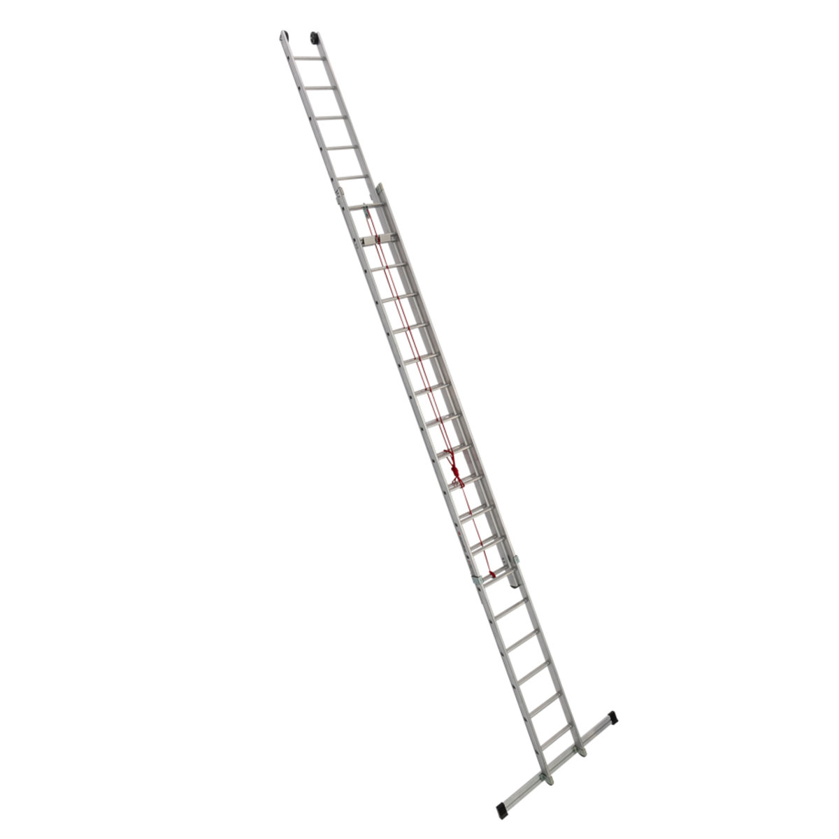 Alu-Seilzugleiter 2-teilig mit 2×18 Sprosseneuroline – der sichere AufstiegDiese Seilzugleiter ist eine der besten Lösungen für jeden, der sehr hoch hinaus will. Besonders Handwerker wie Dachdecker, Elektriker oder Hausmeister arbeiten gerne mit dieser Art von Leitern an hohen Gebäuden oder Baustellen. Obwohl sie sehr lang ist, lässt sie sich mit dem Seil, ganz einfach von einer Person ohne großen Kraftaufwand nach oben ausziehen. Wenn an Wänden gearbeitet werden soll, erleichtern die Wandlaufrollen zusätzlich das Ausziehen der 2-teiligen Anlegeleiter und schonen gleichzeitig die Wand vor Beschädigungen. Fallhaken sorgen für schnelles und einfaches Feststellen an jeder Sprosse. Sprossenabstand 280 mm Breite Quertraverse für sicheren StandVon Sprossen zu Sprosse mit Seil (Ø 12 mm) ausziehbarVollflächig aufliegender FallhakenWaagerechte Auftrittsfläche für sicheren und ermüdungsfreien S…