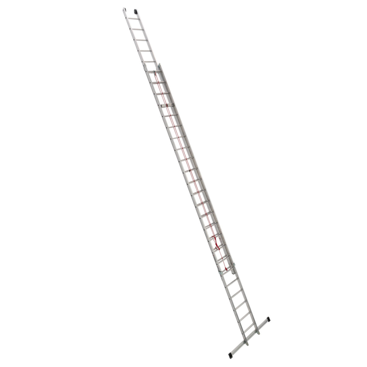 Alu-Seilzugleiter 2-teilig mit 2×24 Sprosseneuroline – der sichere AufstiegDiese Seilzugleiter ist eine der besten Lösungen für jeden, der sehr hoch hinaus will. Besonders Handwerker wie Dachdecker, Elektriker oder Hausmeister arbeiten gerne mit dieser Art von Leitern an hohen Gebäuden oder Baustellen. Obwohl sie sehr lang ist, lässt sie sich mit dem Seil, ganz einfach von einer Person ohne großen Kraftaufwand nach oben ausziehen. Wenn an Wänden gearbeitet werden soll, erleichtern die Wandlaufrollen zusätzlich das Ausziehen der 2-teiligen Anlegeleiter und schonen gleichzeitig die Wand vor Beschädigungen. Fallhaken sorgen für schnelles und einfaches Feststellen an jeder Sprosse. Sprossenabstand 280 mm Breite Quertraverse für sicheren StandVon Sprossen zu Sprosse mit Seil (Ø 12 mm) ausziehbarVollflächig aufliegender FallhakenWaagerechte Auftrittsfläche für sicheren und ermüdungsfreien S…