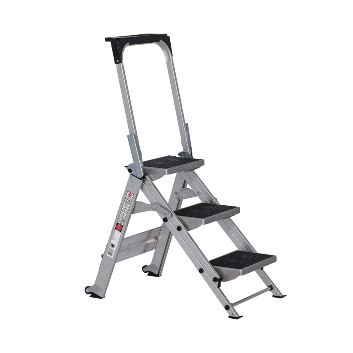 Alu-Sicherheitstreppe klappbar mit Sicherheitsbügel mit 3 Stufeneuroline – der sichere Aufstieg Ob im Handwerk, der Industrie oder zu Hause überall werden kleine Sicherheitstreppen an verschiedensten Stellen gebraucht. Sie können verwendet werden bei Reparaturen in geringer Höhe, um an etwas höhere Regal-/Lagerebenen zu kommen oder um Fenster zu reinigen wo man ohne Erhöhung nicht drankommen würde. Durch das zusammenklappen, lassen sie sich sehr platzsparend verstauen und leicht transportieren. Durch den Bügel und die Transportrollen kann der Tritt auch sehr leicht an einen anderen Arbeitsort gezogen werden. Oben am Bügel ist zusätzlich eine Werkzeugablageschale befestigt, in der sich gut Scheren, Schrauben oder ähnliches ablegen lassen um es jederzeit schnell greifbar zu haben. Großflächige Stufen mit rutschfestem Kunststoffbelag sorgen jederzeit für einen sicheren und ermüdungsfreie…