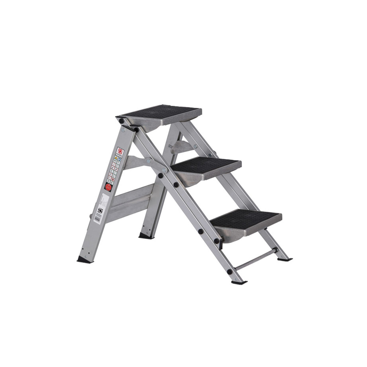 Alu-Sicherheitstreppe klappbar ohne Sicherheitsbügel mit 3 Stufeneuroline – der sichere Aufstieg Ob im Handwerk, der Industrie, zu Hause oder im Stall überall werden kleine Sicherheitstreppen an verschiedensten Stellen gebraucht. Sie können verwendet werden bei Reparaturen in geringer Höhe, um an etwas höhere Regal-/Lagerebenen zu kommen oder um Fenster zu reinigen, welche man ohne Erhöhung nicht erreichen würde. Auch im Reitsport sind diese Klapptreppen Dank der Stabilität und Mobilität die ideale Aufstiegshilfe für den Reiter, welche zugleich auch den Rücken vom Pferd schont.Durch das Zusammenklappen, lassen sie sich sehr platzsparend verstauen und leicht transportieren. Großflächige Stufen mit rutschfestem Kunststoffbelag sorgen jederzeit für einen sicheren und ermüdungsfreien Stand, auch bei Feuchtigkeit.Platzsparende LagerungRutschfester KunststoffbelagGroßflächige StufenDieses P…