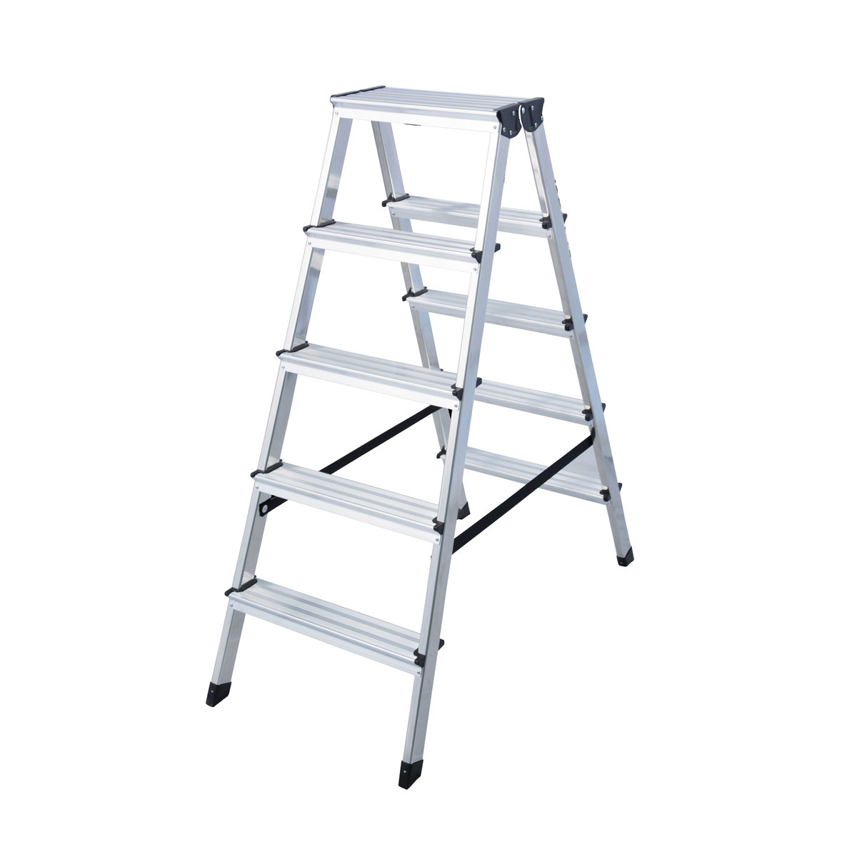 Alu-Stufenstehleiter beidseitig begehbar mit 2×5 Stufeneuroline – der sichere AufstiegDiese vielseitig einsetzbare Leiter kann sowohl im Innen- als auchAußenbereich benutzt werden. Sie kann im privaten Haushalt, derWerkstatt oder im Büro zum Einsatz kommen. Sie ist schnellzusammengeklappt und kann so platzsparend im Abstellraum oder Kelleraufbewahrt werden. Durch ihr leichtes Gewicht und die geringe Länge kannsie gut in Gebäuden transportiert werden. Die rutschfesten Fußkappengeben der Leiter halt und verhindern ein Wegrutschen. Die Leiter hatStufen mit waagerechter Auftrittsfläche, welche für einen sicheren undermüdungsfreien Stand sorgen.Reisfeste GurtbänderRuschfeste FußkappenZusammenklappbarPlatzsparend lagerbarDer Hauptwerkstoff Aluminium kann äußerst ressourcen- undenergieschonend recycelt werden. Produktionsabfälle aus Aluminium werden direkt im Werkgetrennt und wiederverwendet.