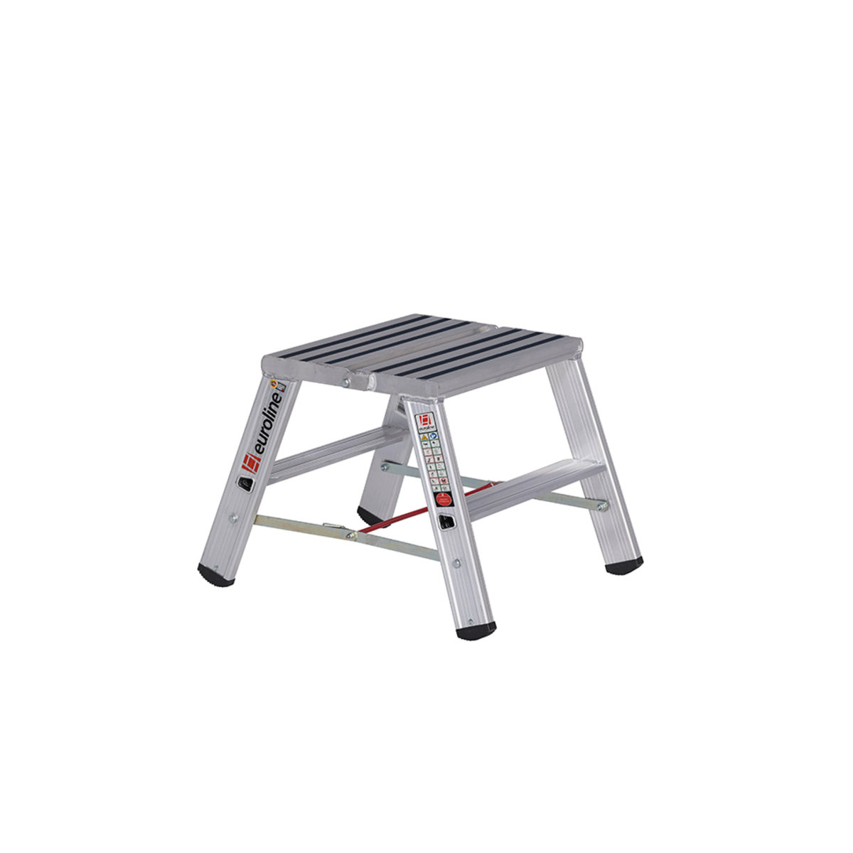 Alu-Stufentritt beidseitig mit 2×2 Stufeneuroline – der sichere AufstiegDer klappbare Stufentritt aus Aluminium ist durch die Einhand-Bedienung für Tätigkeiten in geringer Höhe geeignet, bei denen oft der Standort gewechselt werden muss. Er kommt in der Verwaltung, sowie in der Produktion oder im Handwerk zum Einsatz. Aber auch um Fenster zu reinigen, welche man ohne Erhöhung nicht erreichen würde, sowie im Reitsport um Pferd und Reiter einen bequemeren und für den Pferderücken schonenderen Aufstieg zu ermöglichen. Im Unterschied zu vielen anderen Arbeits- oder Montagetritten kann man auf diese Erhöhung von beiden Seiten aufsteigen. Auf der 500×400 mm großen Standfläche ist bequemes und sicheres Stehen möglich. Einhand-Bedienung durch Scherenbeschlag mit VerbindungsstangeDurch Zusammenklappen ist platzsparende Lagerung möglichObere Standfläche 500×400 mm mit R13 Rutschhemmung für beq…