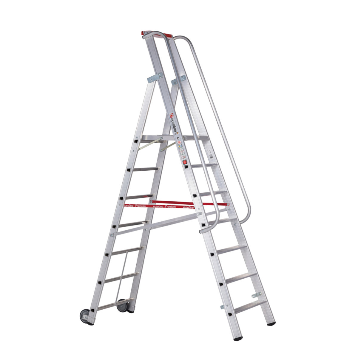 Alu-Stufenstehleiter fahrbar mit großer Standplattform mit R13 Rutschhemmung und 7 Stufeneuroline – der sichere AufstiegDiese einseitig begehbare Stufenstehleiter verfügt über eine große Standplattform und macht so längeres Stehen auf der Leiter sehr angenehm und sicher auch mit schweren Geräten. Sie kann sowohl im Lager, als auch für Handwerksarbeiten aller Art genutzt werden. Aber auch beim Hecke schneiden oder Wohnwagen waschen kann sie zum Einsatz kommen. Durch die 2 Rollen kann sie einfach und schnell zwischen den Arbeitseinsätzen verschoben werden. Die beidseitigen Handläufe erhöhen die Sicherheit sowohl auf den Stufen, als auch auf der Plattform. Die Leiter entspricht der neuen TRBS 2121-2 (Technische Regeln für Betriebssicherheit).Inklusive 2 Handläufe zum SelbstanbauGroße Standplattform 480 x 415 mm mit R13 Rutschhemmung für bequemes und sicheres Stehen2 Rollen (⌀ 125mm…