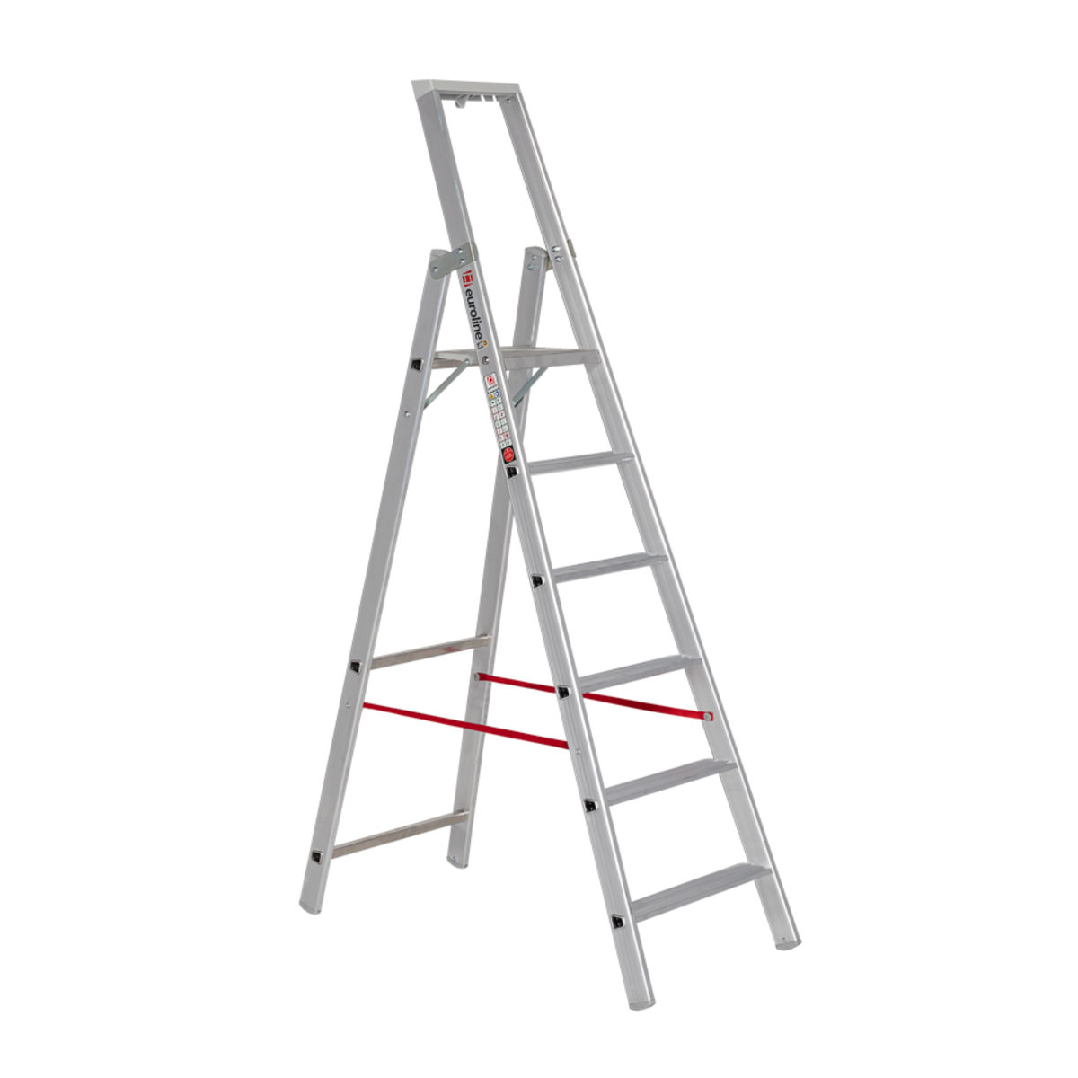 Alu-Stufenstehleiter mit Sicherheitsbrücke und 6 Stufeneuroline – der sichere Aufstieg Auf dieser euroline Alu-Stufenstehleiter haben Sie beiverschiedensten Tätigkeiten im Innen- und Außenbereich immer einensicheren Stand. Neuste Anforderung an die Sicherheit sind mit dieserLeiter vollumfänglich erfüllt, wenn Sie Montagearbeiten oder ähnliches vornehmen wollen.Aber auch im Haushalt oder Garten kann diese Leiter perfekt zum Reinigen, Reparieren, Dekorieren oder Bäume schneiden eingesetzt werden. In der Werkzeugablageschale lassen sich perfekt Schere, Schraubenschlüssel oder ähnliches ablegen um die Hände zum Arbeiten frei zu haben.Entspricht der neuen TRBS 2121-2 (Technische Regeln für Betriebssicherheit)Stufen mit 80mm waagerechter Auftrittsfläche für sicheren und ermüdungsfreien Stand, Stufenabstand 250mmRechteck-Holmprofil mit hoher StabilitätProfilierte GummifüßeMit Werkzeugablages…