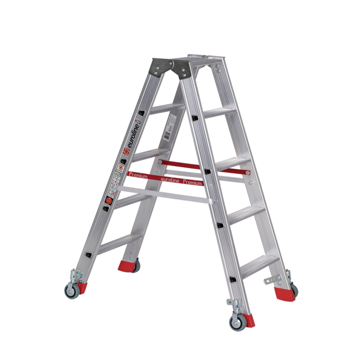 Alu-Stufenstehleiter beidseitig begehbar, mit 2×5 Stufen mit Federrollern und FeststellernGeeignet als Verkehrsweg und Arbeitsplatz gemäß TRBS 2121-2 euroline – der sichere AufstiegDiese von beiden Seiten begehbare Alu-Stufenstehleiter eignet sich für den Profi-Einsatz in nahezu jedem Innen- und Außenbereich. Erhältlich in 6 verschiedenen Größen, jeweils mit 4 montierten Federrollen und 2 montierten Feststellern, bildet diese Leiter die ideale, leicht verfahrbare Steighilfe für das Arbeiten in den verschiedenen Höhen. Ob bei Handwerks- oder Reinigungsarbeiten oder Reparaturen: die stranggepressten Aluminiumprofile sorgen für eine sehr hohe Stabilität bei gleichzeitig geringem Gewicht. Stufen mit 80 mm waagerechter Auftrittsfläche für sicheren und ermüdungsfreien StandStufenabstand 250 mmStranggepresste Stufenprofile mit starker Profilierung für verbesserte RutschhemmungHolme aus stran…
