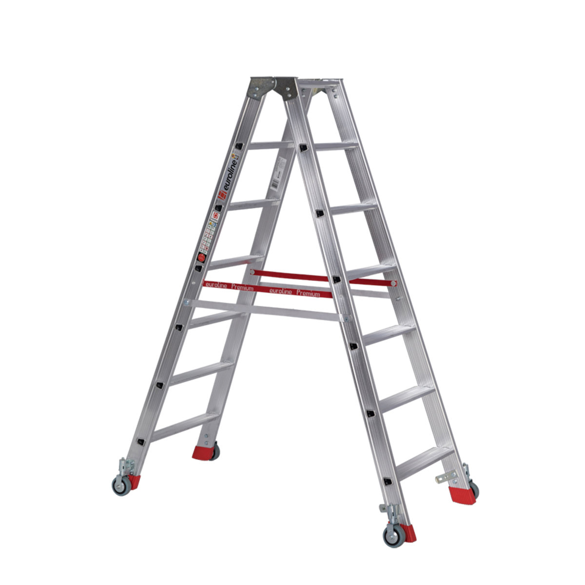 Alu-Stufenstehleiter beidseitig begehbar, mit 2×7 Stufen mit Federrollern und FeststellernGeeignet als Verkehrsweg und Arbeitsplatz gemäß TRBS 2121-2 euroline – der sichere AufstiegDiese von beiden Seiten begehbare Alu-Stufenstehleiter eignet sich für den Profi-Einsatz in nahezu jedem Innen- und Außenbereich. Erhältlich in 6 verschiedenen Größen, jeweils mit 4 montierten Federrollen und 2 montierten Feststellern, bildet diese Leiter die ideale, leicht verfahrbare Steighilfe für das Arbeiten in den verschiedenen Höhen. Ob bei Handwerks- oder Reinigungsarbeiten oder Reparaturen: die stranggepressten Aluminiumprofile sorgen für eine sehr hohe Stabilität bei gleichzeitig geringem Gewicht. Stufen mit 80 mm waagerechter Auftrittsfläche für sicheren und ermüdungsfreien StandStufenabstand 250 mmStranggepresste Stufenprofile mit starker Profilierung für verbesserte RutschhemmungHolme aus stran…