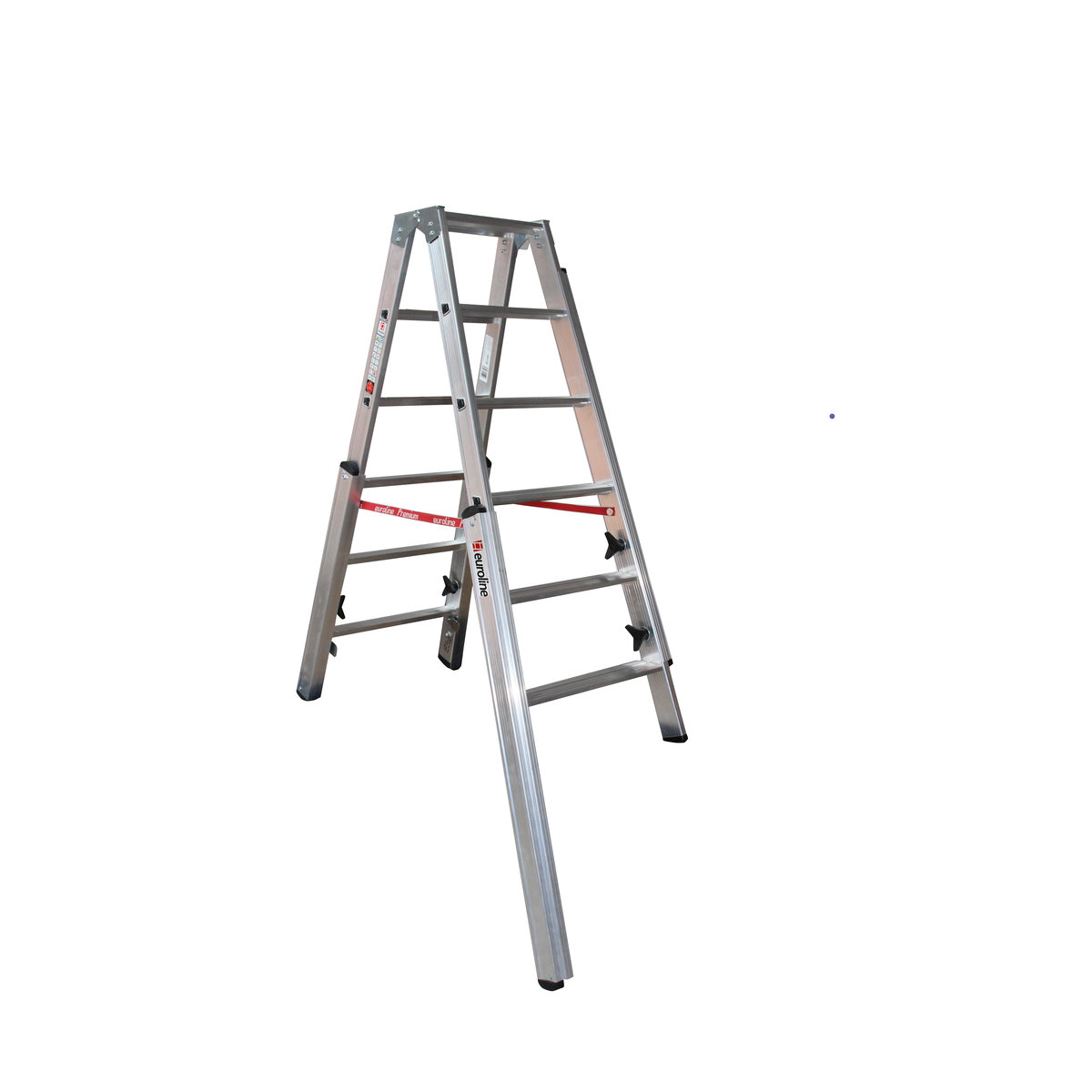 Alu-Stufentreppenstehleiter mit 6 Stufeneuroline – der sichere AufstiegStufen statt Sprossen: So lautet die Empfehlung, wenn Leitern nicht nur zum Aufstieg, sondern auch als Arbeitsplatz genutzt werden. Mit dieser euroline Alu-Stufentreppenstehleiter aus der Premium-Line arbeiten sie TRBS 2121-2 konform. Sie ist optimal für das Erreichen von höher gelegenen Einsatzorten an und über Treppen geeignet. Durch die vier stufenlos verstellbaren und mittels Sterngriff leicht zu arretierenden Holme gleichen Sie mühelos die jeweiligen Höhenunterschiede im Innen- und Außenbereich aus und gelangen so auch an sonst nur schlecht zu erreichende Stellen. Ob bei Reparaturen oder Handwerksarbeiten: die waagerechten Auftrittsflächen sorgen für einen ermüdungsfreien und sicheren Stand. Dank der starken Profilierung der Stufen ist eine verbesserte Rutschhemmung jederzeit gegeben. Erhältlich in zwei versch…