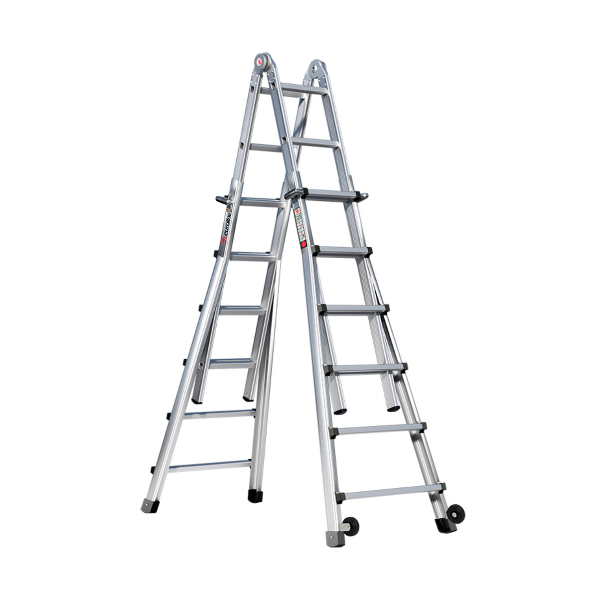 Alu-Vario-Klappleiter mit Rollen Nr. 31621 Teleskopleiter mit 4×6 Sprosseneuroline – der sichere AufstiegVielseitig, sicher, kompakt – die euroline Alu-Vario-Klappleiter ist ein AllrounderOb als lange Anlegeleiter für Arbeiten an Fassaden oder als kompakte Stehleiter/Bockleiter für Innenräume – sie passt sich flexibel jedem Einsatzzweck an. Da beide Seiten der Leiter unabhängig voneinander in der Höhe verstellbar sind, kann die Leiter auch auf Treppen und Absätzen verwendet werden. Die Leiter besteht aus einer Stehleiter verbunden mit zwei Sicherheitsgelenken und zwei Außenteilen welche mittels Stellgriffen in der Länge verstellbar sind. Durch stufenweises Ausziehen bzw. Ausklappen wird die Steighilfe aus stranggepresstem Aluminium sekundenschnell umfunktioniert. Für den Transport oder die Lagerung wird sie auf kompakte Größe zusammengeklappt. Diese Teleskopleiter ist mit Sicherheits…