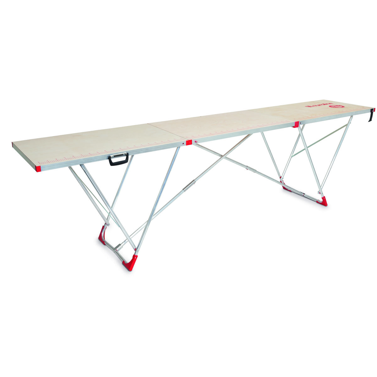 eurotap Alu-Tapeziertisch 80cm breit in 3,00m Längeeuroline – der sichere AufstiegBei diesen Tapeziertischen ist die Arbeitsplatte aus massivem Sperrholz gefertigt, für komfortables Arbeiten und schnelles Abmessen der Tapetenbahnen ist ein Lineal aufgedruckt. Umlaufend ist die Arbeitsplatte mit einem Aluminium-Rahmen verstärkt, dies sorgt für noch mehr Festigkeit und Stoßsicherheit. Mit einer Arbeitshöhe von 86cm haben die euroline Alu-Tapeziertische die richtige Höhe für ergonomisches Arbeiten. Die Aluminium-Rohrgestelle der Tische sind stark dimensioniert und gewährleisten dadurch einen stabilen Stand. Auch hohe Gewichte, z.B. von voll gefüllten Kleistergeräten, werden über den Aluminium-Rahmen abgeleitet und stellen für die Unterkonstruktion und die Scharniere der einzelnen Tischplatten kein Problem dar.Stark dimensionierte AluminiumprofileAufgedrucktes MaßbandDiese Tische sind mit…