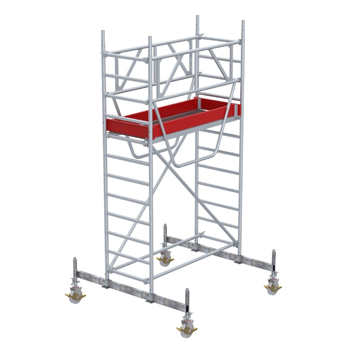 Gerüsttyp 9522 mit Fahrbalken starr und Sicherheitsgeländer Plattform 0,75 x 1,80 m euroline – der sichere Aufstieg Die euroline Fahrgerüste zeichnen sich durch ihre hohe Qualität und Anwenderfreundlichkeit aus: Ausführung wie 9512 jedoch mit vorlaufenden Sicherheitsgeländern Vorlaufendes Sicherheitsgeländer: Von der unteren Ebene nach oben einhängbar, dadurch muss keine Plattform bei Auf- und Abbau ohne Geländer betreten werden Plattform 0,75 x 1,80 m Fahrbalken starr, durch Umstecken kann das Gerüst auf dem Fahrbalken anders positioniert werden Rollen mit Spezialbeschichtung für empfindliche Böden Durch das Baukastensystem sind euroline Fahrgerüste flexibel einsetzbar und individuell für jeden Einsatzkonfigurierbar, die Fahrgerüste sind jederzeit erweiter- und umbaubar DasSystem bietet hohe Flexibilität bei der Arbeitshöhe: Die Plattformensind i…