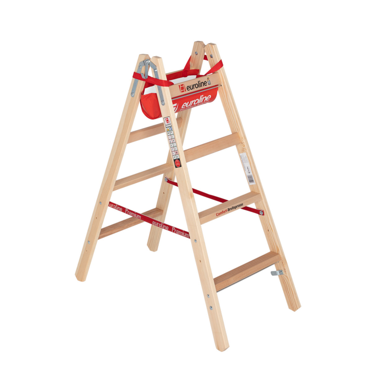 Holz-Sprossenleiter mit Comfort-Breitsprosse und Eimerhaken 2×4 Sprosseneuroline – der sichere AufstiegDie klassische Malerleiter mit breiteren Standflächen von 50 mm – für mehr Komfort und Sicherheit. Diese breite Standfläche ermöglicht auch bei längeren Arbeiten einen ermüdungsfreien Stand und schont das Fußgelenk. Die oberen Sprossen sind wie üblich senkrecht. Da man auf beidseitig begehbaren Stehleitern maximal auf der 3. Sprossevon oben stehen darf, kann man sich an die oberen Sprossen bequem anlehnen.Comfort – BreitsprosseDie stabile Hartholzsprosse bietet eine 50mm breite AuftrittflächeDurch den waagerechten Einbau steht man ermüdungsfreiDie Sprosse ist geriffelt und damit rutschsicherSerienmäßig mit Werkzeugablagetasche Art.-Nr. 1990006Sicherheitsverzapfung der SprossenZylinderische FingerzapfenLanglebige Holm-Sprossen-VerbindungMillionenfach bewährtStabile Hartholzsprosse (5…