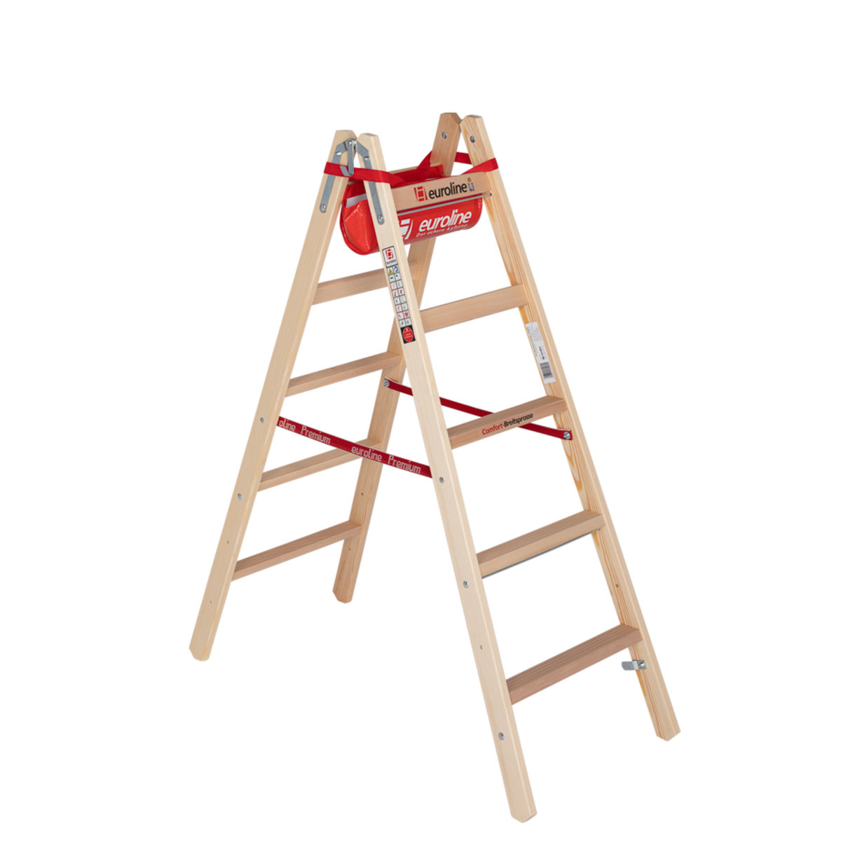 Holz-Sprossenleiter mit Comfort-Breitsprosse und Eimerhaken 2×5 Sprosseneuroline – der sichere AufstiegDie klassische Malerleiter mit breiteren Standflächen von 50mm – für mehr Komfort und Sicherheit. Diese breite Standfläche ermöglicht auch bei längeren Arbeiten einen ermüdungsfreien Stand und schont das Fußgelenk. Die oberen Sprossen sind wie üblich senkrecht. Da man auf beidseitig begehbaren Stehleitern maximal auf der 3. Sprossevon oben stehen darf, kann man sich an die oberen Sprossen bequem anlehnen.Comfort – BreitsprosseDie stabile Hartholzsprosse bietet eine 50mm breite AuftrittflächeDurch den waagerechten Einbau steht man ermüdungsfreiDie Sprosse ist geriffelt und damit rutschsicherSerienmäßig mit Werkzeugablagetasche Art.-Nr. 1990006Sicherheitsverzapfung der SprossenZylinderische FingerzapfenLanglebige Holm-Sprossen-VerbindungMillionenfach bewährtStabile Hartholzsprosse (50…