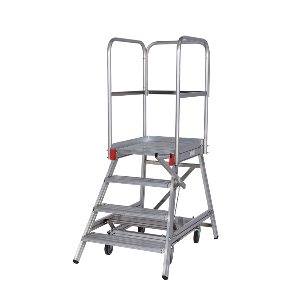Mobile Podesttreppe / Podestleiter einseitig begehbar mit Zentralfeststellung* mit 4 Stufeneuroline – der sichere AufstiegDiese mobile Aluminium-Podesttreppe der eurolinePREMIUMline mit Zentralfeststellung* eignet sich besonders gut im Lager, um komfortabel und sicher an höher gelegene Regale zu gelangen. Dank der schlanken Standbreite ist sie ideal dazu geeignet dicht an die Regale heranzufahren. Sie kann als Steighilfe in allen Arbeitsbereichen zum Einsatz kommen und bietet durch die breiten Auftrittsflächen der Stufen einen bequemen Auf- und Abstieg. Die große Plattform gewährleistet einen sicheren und angenehmen Stand. Das fahrbare Podest ist einseitig begehbar und kann durch 4 Lenkrollen schnell und mit wenig Kraftaufwand in alle Richtungen verschoben werden. Die Lenkrollen arretieren bei Besteigen der Treppe automatisch. Einseitig begehbar Stufen mit einer breit…
