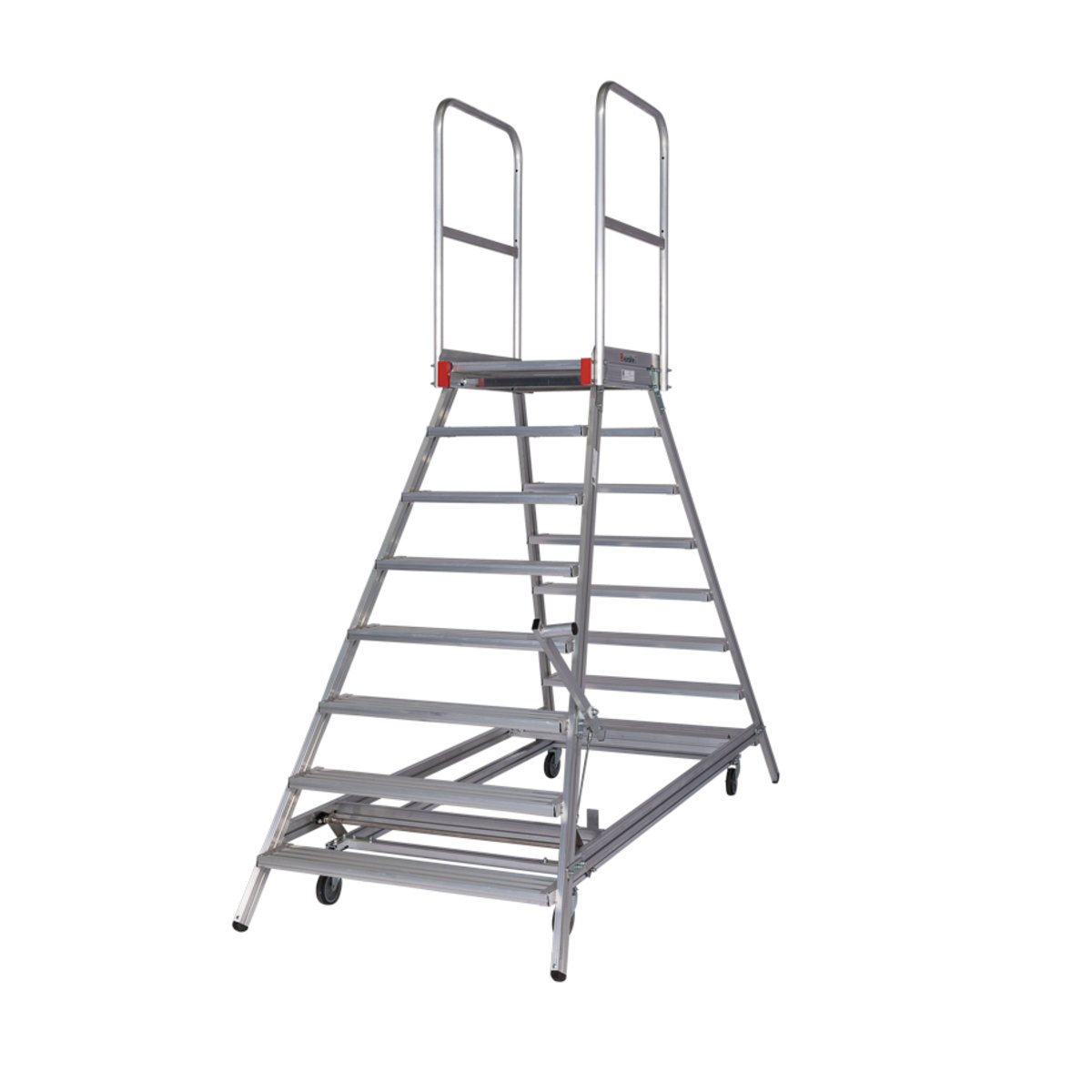 Mobile Podesttreppe / Podestleiter zweiseitig begehbar mit Zentralfeststellung* mit 2×8 Stufeneuroline – der sichere AufstiegDiese mobile Aluminium-Podesttreppe der eurolinePREMIUMline mit Zentralfeststellung* eignet sich besonders gut im Lager, um komfortabel und sicher an höher gelegene Regale zu gelangen. Dank der schlanken Standbreite ist sie ideal dazu geeignet dicht an die Regale heranzufahren. Sie kann als Steighilfe in allen Arbeitsbereichen zum Einsatz kommen und bietet durch die breiten Auftrittsflächen der Stufen einen bequemen Auf- und Abstieg. Die große Plattform gewährleistet einen sicheren und angenehmen Stand. Das fahrbare Podest ist zweiseitig begehbar und kann durch 4 Lenkrollen schnell und mit wenig Kraftaufwand in alle Richtungen verschoben werden. Die Lenkrollen arretieren bei Besteigen der Treppe automatisch. Zweiseitig begehbar Stufen mit einer …
