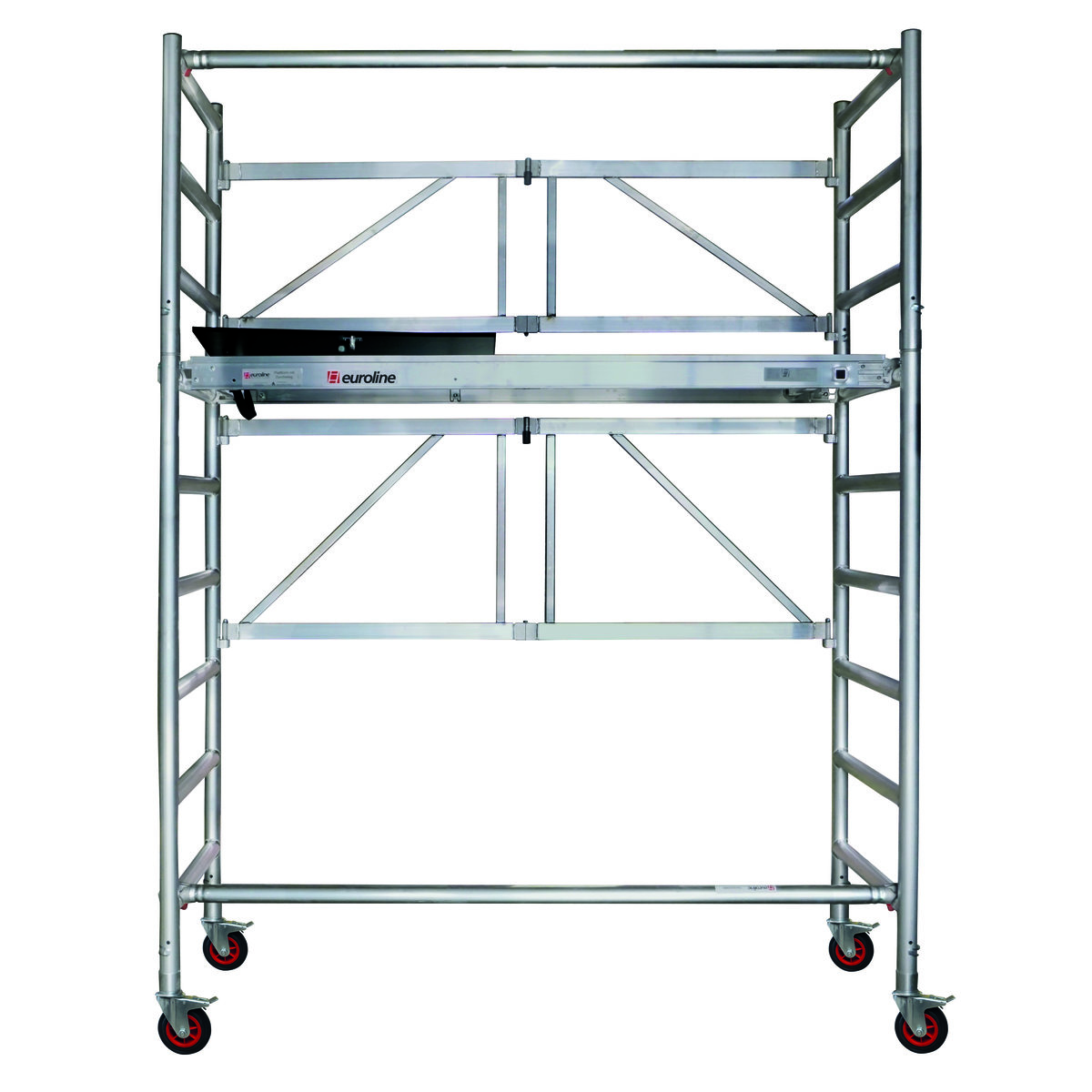 Nr. 9400 Klapp-/Fahrgerüst (Typ 0,75 x 1,90)euroline – der sichere AufstiegDieses praktische Gerüst aus Aluminium eignet sich für Handwerks- und Reparaturarbeiten aller Art. Es kann sowohl im Innen- als auch im Außenbereich eingesetzt werden. Das Gerüst lässt sich schnell und unkompiziert ohne Werkzeug von einer Person alleine Aufbauen. Dank der 4 Rollen kann es dann leicht zwischen den Arbeitseinsätzen verschoben werden. Alle 4 Rollen verfügen über Feststellbremsen, was die Standsicherheit auf dem Gerüst erhöht. Eine weitere Besonderheit ist, dass das Gerüst klappbar ist und so platzsparend gelagert und transportiert werden kann. Es passt sogar in einen großen PKW Kofferraum.Plattform 0,75 x 1,90 mPlattform mit DurchstiegKompaktes System, einfach zu transportierenKompakt zu lagernPraktischer Schließmechanismus für schnelle MontageVerschweißter GelenkträgerVerschweißte Holm-/Sprossenv…