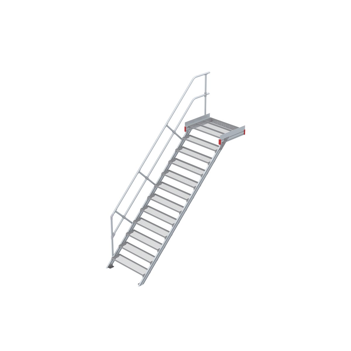 Podesttreppe 45° mit 12 Stufen 1000 mm breiteuroline – der sichere AufstiegStahl Gitterrost – Podesttreppen für individuelle Lösungen: Wetterfest, robust, sehr stabil und belastbar. Für das sichere Erreichen von Zwischenböden, höher gelegenen Türen an Industriehallen oder anderen Gebäuden oder für Wartungsarbeiten an Fertigungslinien. Die hervorragend verarbeitete Steigtechnik Produktserie vereint Sicherheit und Flexibilität. Die verschiedenen Steigungswinkel; 45° für einen bequemen Aufstieg, 60° für beengte Platzverhältnisse, 3 Standard-Stufenbreiten (600 mm, 800 mm, 1000 mm) finden Sie in unseren Empfehlungen verlinkt. Als Standard – Stufenausführungen haben Sie die Wahl zwischen Stufen in Alu-gerieft oder Stahl-Gitterroststufen. Gitterrost bietet den Vorteil, dass Schmutz und Flüssigkeiten, wie Regenwasser einfacher entweichen können. Dadurch ist die Treppe besonders im Außenbereic…
