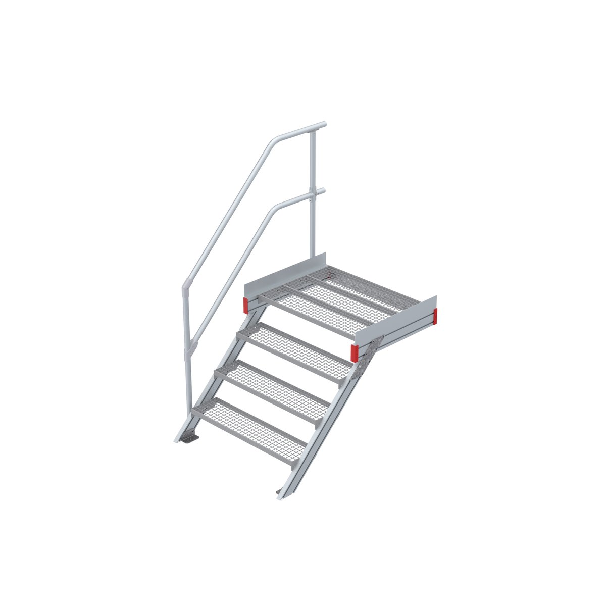 Podesttreppe 45° mit 4 Stufen 1000 mm breiteuroline – der sichere AufstiegStahl Gitterrost – Podesttreppen für individuelle Lösungen: Wetterfest, robust, sehr stabil und belastbar. Für das sichere Erreichen von Zwischenböden, höher gelegenen Türen an Industriehallen oder anderen Gebäuden oder für Wartungsarbeiten an Fertigungslinien. Die hervorragend verarbeitete Steigtechnik Produktserie vereint Sicherheit und Flexibilität. Die verschiedenen Steigungswinkel; 45° für einen bequemen Aufstieg, 60° für beengte Platzverhältnisse, 3 Standard-Stufenbreiten (600 mm, 800 mm, 1000 mm) finden Sie in unseren Empfehlungen verlinkt. Als Standard – Stufenausführungen haben Sie die Wahl zwischen Stufen in Alu-gerieft oder Stahl-Gitterroststufen. Gitterrost bietet den Vorteil, dass Schmutz und Flüssigkeiten, wie Regenwasser einfacher entweichen können. Dadurch ist die Treppe besonders im Außenbereich…