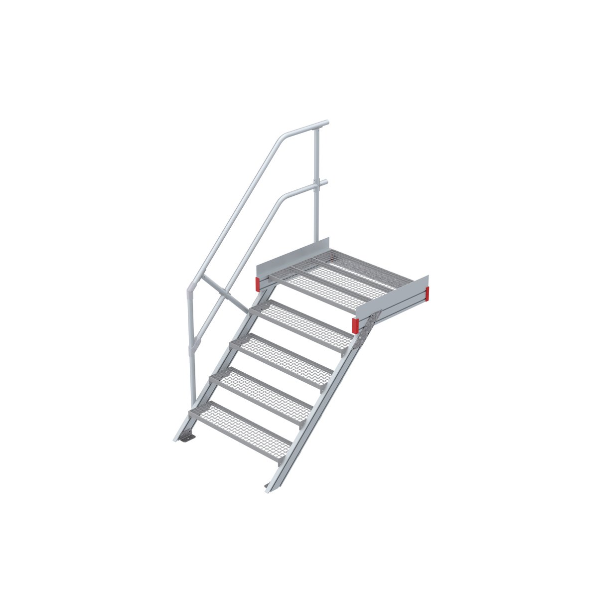 Podesttreppe 45° mit 5 Stufen 1000 mm breiteuroline – der sichere AufstiegStahl Gitterrost – Podesttreppen für individuelle Lösungen: Wetterfest, robust, sehr stabil und belastbar. Für das sichere Erreichen von Zwischenböden, höher gelegenen Türen an Industriehallen oder anderen Gebäuden oder für Wartungsarbeiten an Fertigungslinien. Die hervorragend verarbeitete Steigtechnik Produktserie vereint Sicherheit und Flexibilität. Die verschiedenen Steigungswinkel; 45° für einen bequemen Aufstieg, 60° für beengte Platzverhältnisse, 3 Standard-Stufenbreiten (600 mm, 800 mm, 1000 mm) finden Sie in unseren Empfehlungen verlinkt. Als Standard – Stufenausführungen haben Sie die Wahl zwischen Stufen in Alu-gerieft oder Stahl-Gitterroststufen. Gitterrost bietet den Vorteil, dass Schmutz und Flüssigkeiten, wie Regenwasser einfacher entweichen können. Dadurch ist die Treppe besonders im Außenbereich…