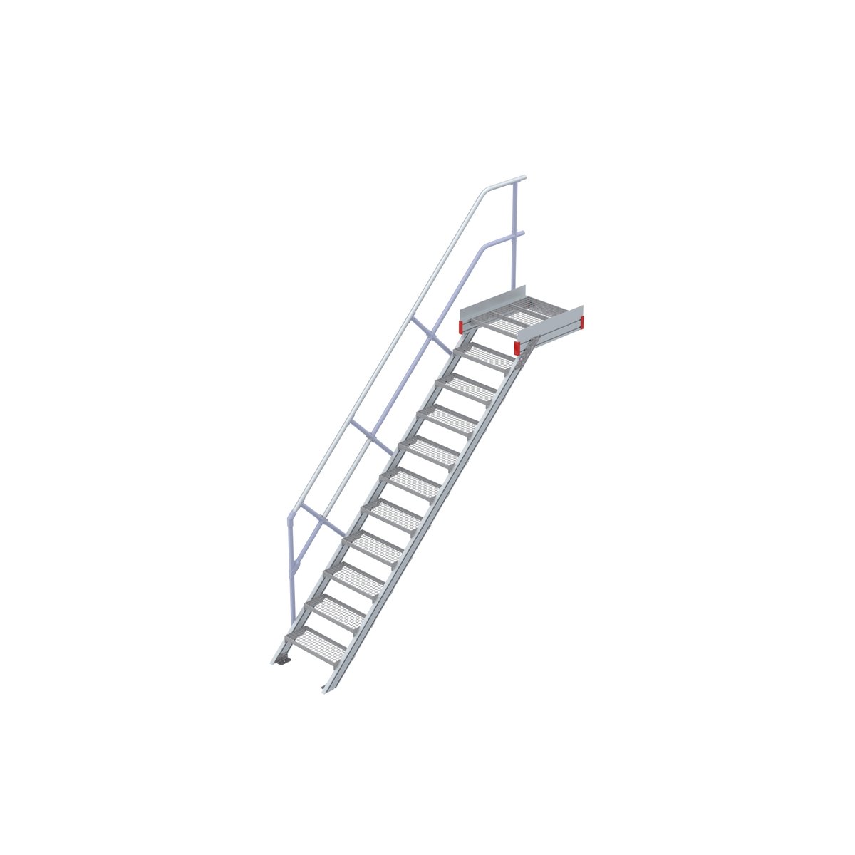 Podesttreppe 45° mit 11 Stufen 600 mm breiteuroline – der sichere AufstiegStahl Gitterrost – Podesttreppen für individuelle Lösungen: Wetterfest, robust, sehr stabil und belastbar. Für das sichere Erreichen von Zwischenböden, höher gelegenen Türen an Industriehallen oder anderen Gebäuden oder für Wartungsarbeiten an Fertigungslinien. Die hervorragend verarbeitete Steigtechnik Produktserie vereint Sicherheit und Flexibilität. Die verschiedenen Steigungswinkel; 45° für einen bequemen Aufstieg, 60° für beengte Platzverhältnisse, 3 Standard-Stufenbreiten (600 mm, 800 mm, 1000 mm) finden Sie in unseren Empfehlungen verlinkt. Als Standard – Stufenausführungen haben Sie die Wahl zwischen Stufen in Alu-gerieft oder Stahl-Gitterroststufen. Gitterrost bietet den Vorteil, dass Schmutz und Flüssigkeiten, wie Regenwasser einfacher entweichen können. Dadurch ist die Treppe besonders im Außenbereich…