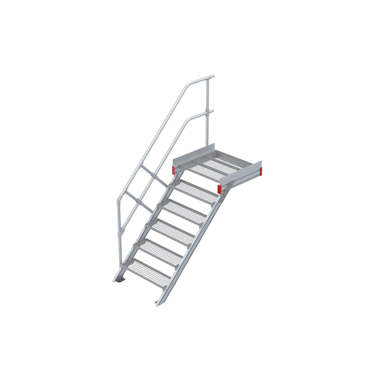Podesttreppe 45° mit 6 Stufen 800 mm breiteuroline – der sichere AufstiegStahl Gitterrost – Podesttreppen für individuelle Lösungen: Wetterfest, robust, sehr stabil und belastbar. Für das sichere Erreichen von Zwischenböden, höher gelegenen Türen an Industriehallen oder anderen Gebäuden oder für Wartungsarbeiten an Fertigungslinien. Die hervorragend verarbeitete Steigtechnik Produktserie vereint Sicherheit und Flexibilität. Die verschiedenen Steigungswinkel; 45° für einen bequemen Aufstieg, 60° für beengte Platzverhältnisse, 3 Standard-Stufenbreiten (600 mm, 800 mm, 1000 mm) finden Sie in unseren Empfehlungen verlinkt. Als Standard – Stufenausführungen haben Sie die Wahl zwischen Stufen in Alu-gerieft oder Stahl-Gitterroststufen. Gitterrost bietet den Vorteil, dass Schmutz und Flüssigkeiten, wie Regenwasser einfacher entweichen können. Dadurch ist die Treppe besonders im Außenbereich …