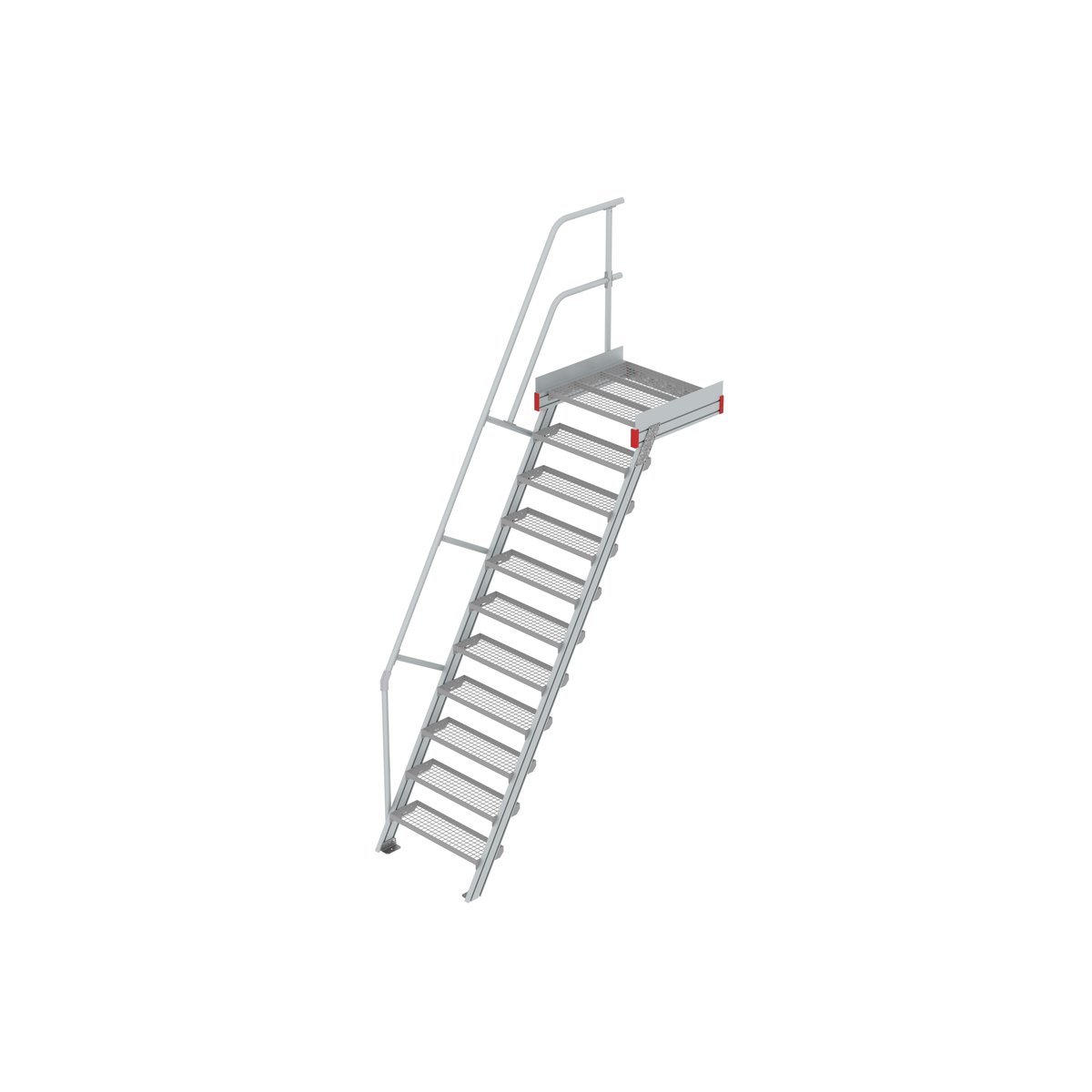 Podesttreppe 60° mit 11 Stufen 800 mm breiteuroline – der sichere AufstiegStahl Gitterrost – Podesttreppen für individuelle Lösungen: Wetterfest, robust, sehr stabil und belastbar. Für das sichere Erreichen von Zwischenböden, höher gelegenen Türen an Industriehallen oder anderen Gebäuden oder für Wartungsarbeiten an Fertigungslinien. Die hervorragend verarbeitete Steigtechnik Produktserie vereint Sicherheit und Flexibilität. Die verschiedenen Steigungswinkel; 45° für einen bequemen Aufstieg, 60° für beengte Platzverhältnisse, 3 Standard-Stufenbreiten (600 mm, 800 mm, 1000 mm) finden Sie in unseren Empfehlungen verlinkt. Als Standard – Stufenausführungen haben Sie die Wahl zwischen Stufen in Alu-gerieft oder Stahl-Gitterroststufen. Gitterrost bietet den Vorteil, dass Schmutz und Flüssigkeiten, wie Regenwasser einfacher entweichen können. Dadurch ist die Treppe besonders im Außenbereich…