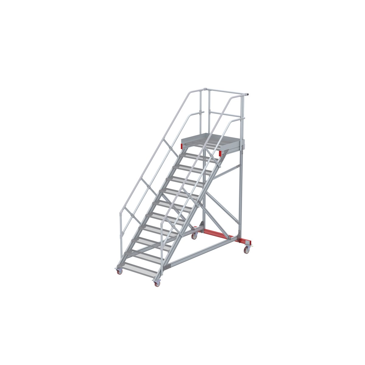 Wartungsbühne 45° mit 11 Stufen 1000 mm breiteuroline – der sichere AufstiegMobile – Wartungsbühnen als sicheres und flexibles Arbeitsmittel. Geeignet für Arbeiten an großen Maschinen, Containern, Nutzfahrzeugen oder Regalen. Durch die leichtgängigen Lenkrollen können die Wartungsbühnen flexibel und einfach an verschiedene Einsatzorte transportiert werden.Diese Wartungsbühnen sind in der Standardausführung für unterschiedliche örtliche Gegebenheiten in zahlreichen Ausführungen verfügbar, welche Sie in unseren Empfehlungen verlinkt finden. Die hervorragend verarbeitete Steigtechnik Produktserie mit wählbaren Steigungswinkeln (45° für einen bequemen Aufstieg, 60° für beengte Platzverhältnisse) verschiedene Höhen und 3 Standard Stufenbreiten (600 mm, 800 mm, 1000 mm), vereinen Sicherheit und Flexibilität. Als Standard – Stufenausführungen haben Sie die Wahl zwischen Stufen in Alu-gerieft…