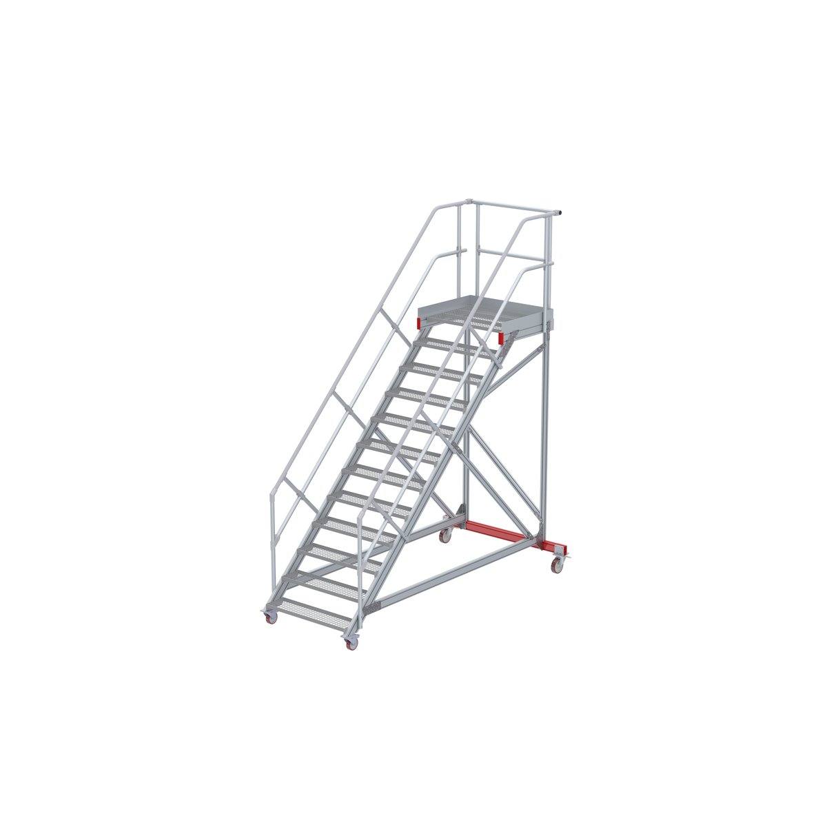 Wartungsbühne 45° mit 12 Stufen 1000 mm breiteuroline – der sichere AufstiegMobile – Wartungsbühnen als sicheres und flexibles Arbeitsmittel. Geeignet für Arbeiten an großen Maschinen, Containern, Nutzfahrzeugen oder Regalen. Durch die leichtgängigen Lenkrollen können die Wartungsbühnen flexibel und einfach an verschiedene Einsatzorte transportiert werden.Diese Wartungsbühnen sind in der Standardausführung für unterschiedliche örtliche Gegebenheiten in zahlreichen Ausführungen verfügbar, welche Sie in unseren Empfehlungen verlinkt finden. Die hervorragend verarbeitete Steigtechnik Produktserie mit wählbaren Steigungswinkeln (45° für einen bequemen Aufstieg, 60° für beengte Platzverhältnisse) verschiedene Höhen und 3 Standard Stufenbreiten (600 mm, 800 mm, 1000 mm), vereinen Sicherheit und Flexibilität. Als Standard – Stufenausführungen haben Sie die Wahl zwischen Stufen in Alu-gerieft…