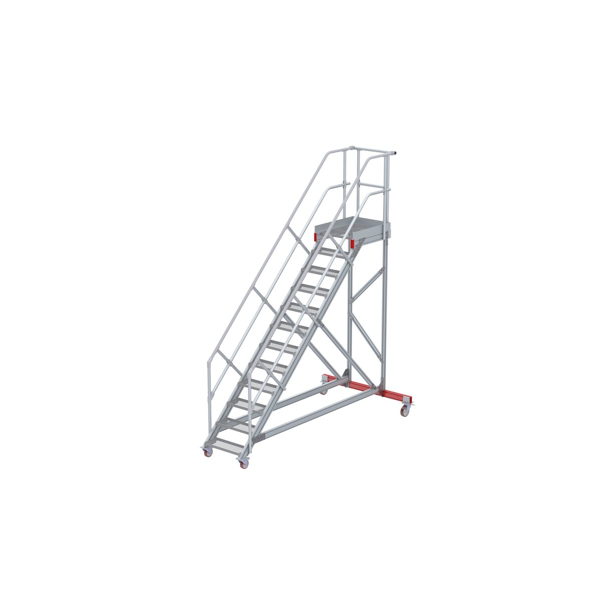 Wartungsbühne 45° mit 12 Stufen 600 mm breiteuroline – der sichere AufstiegMobile – Wartungsbühnen als sicheres und flexibles Arbeitsmittel. Geeignet für Arbeiten an großen Maschinen, Containern, Nutzfahrzeugen oder Regalen. Durch die leichtgängigen Lenkrollen können die Wartungsbühnen flexibel und einfach an verschiedene Einsatzorte transportiert werden.Diese Wartungsbühnen sind in der Standardausführung für unterschiedliche örtliche Gegebenheiten in zahlreichen Ausführungen verfügbar, welche Sie in unseren Empfehlungen verlinkt finden. Die hervorragend verarbeitete Steigtechnik Produktserie mit wählbaren Steigungswinkeln (45° für einen bequemen Aufstieg, 60° für beengte Platzverhältnisse) verschiedene Höhen und 3 Standard Stufenbreiten (600 mm, 800 mm, 1000 mm), vereinen Sicherheit und Flexibilität. Als Standard – Stufenausführungen haben Sie die Wahl zwischen Stufen in Alu-gerieft …