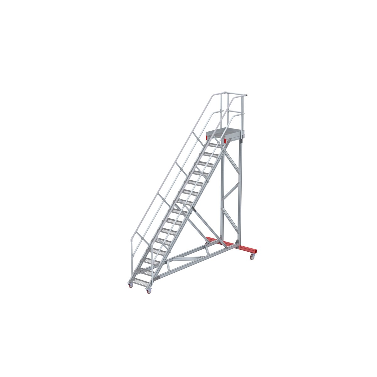Wartungsbühne 45° mit 16 Stufen 600 mm breiteuroline – der sichere AufstiegMobile – Wartungsbühnen als sicheres und flexibles Arbeitsmittel. Geeignet für Arbeiten an großen Maschinen, Containern, Nutzfahrzeugen oder Regalen. Durch die leichtgängigen Lenkrollen können die Wartungsbühnen flexibel und einfach an verschiedene Einsatzorte transportiert werden.Diese Wartungsbühnen sind in der Standardausführung für unterschiedliche örtliche Gegebenheiten in zahlreichen Ausführungen verfügbar, welche Sie in unseren Empfehlungen verlinkt finden. Die hervorragend verarbeitete Steigtechnik Produktserie mit wählbaren Steigungswinkeln (45° für einen bequemen Aufstieg, 60° für beengte Platzverhältnisse) verschiedene Höhen und 3 Standard Stufenbreiten (600 mm, 800 mm, 1000 mm), vereinen Sicherheit und Flexibilität. Als Standard – Stufenausführungen haben Sie die Wahl zwischen Stufen in Alu-gerieft …