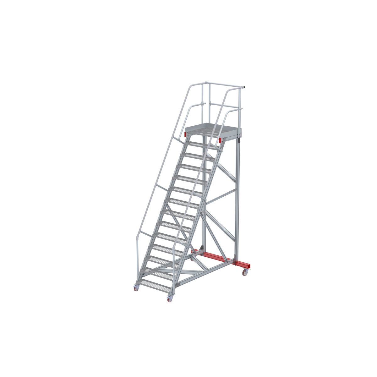 Wartungsbühne 60° mit 14 Stufen 1000 mm breiteuroline – der sichere AufstiegMobile – Wartungsbühnen als sicheres und flexibles Arbeitsmittel. Geeignet für Arbeiten an großen Maschinen, Containern, Nutzfahrzeugen oder Regalen. Durch die leichtgängigen Lenkrollen können die Wartungsbühnen flexibel und einfach an verschiedene Einsatzorte transportiert werden.Diese Wartungsbühnen sind in der Standardausführung für unterschiedliche örtliche Gegebenheiten in zahlreichen Ausführungen verfügbar, welche Sie in unseren Empfehlungen verlinkt finden. Die hervorragend verarbeitete Steigtechnik Produktserie mit wählbaren Steigungswinkeln (45° für einen bequemen Aufstieg, 60° für beengte Platzverhältnisse) verschiedene Höhen und 3 Standard Stufenbreiten (600 mm, 800 mm, 1000 mm), vereinen Sicherheit und Flexibilität. Als Standard – Stufenausführungen haben Sie die Wahl zwischen Stufen in Alu-gerieft…