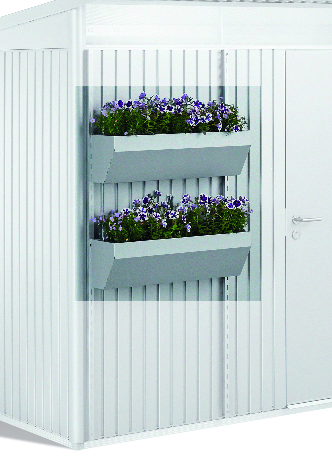 Zwei Steher werden an der Außenwand des Gerätehauses angeschraubt und die Blumenkästen in beliebiger Höhe eingehängt. Kunststoffeinsätze, zur einfacheren Bepflanzung, werden standardmäßig mitgeliefert.