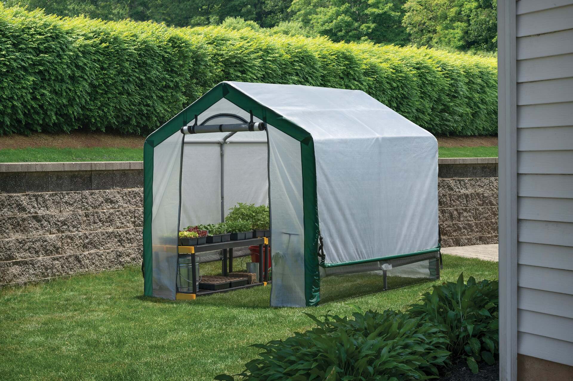 Foliengewächshaus 180x240x200 cm ShelterLogic Gewächshaus Das mobile Gewächshaus von ShelterLogic ist Dank einfachem Auf- und Abbau optimal für den saisonalen Gebrauch geeignet. Speziell Tomaten können in diesem Gewächshaus geschützt und sicher angezogen werden. Die hochwertige Plane aus Polyethylen (160g/m²) ist UV-beständig und durch eine spezielle Versiegelung sowie eine nahtlose Verarbeitung absolut wasserdicht. Das massive Gestell aus 3,5 cm dickem Stahl ist zusätzlich beschichtet und dadurch bestens geschützt vor Rost und Witterungseinflüssen. Eine hohe Lebensdauer und langer Gärtnerspaß sind somit garantiert. Patentierte Stabilisatoren (ShelterLogic® 3X Steel Stabilizers) gewährleisten eine besonders hohe Belastbarkeit der Konstruktion ? dreimal höher als bei anderen Foliengewächshäusern. Für eine ausgewogene Luftzirkulation im Gewächshaus sorgen zwei Fenster: eines in der Tür im Eingangsbereich sowie ein weiteres an der Rückseite. Die Seitenwände lassen sich einfach aufrollen und befestigen, sodass eine optimale Belüftung auch bei hohen Temperaturen im Sommer gewährleistet ist. Ihre Pflanzen werden durch die integrierten Moskitonetze geschützt. Im Lieferumfang enthalten sind 4 Sturmanker, die für eine eine sichere Befestigung am Boden sorgen. Boden. Ein Fundament ist nicht notwendig. – Breite: 180, – Gewicht: 25, – Höhe: 200, – Länge: 240, – Material: Stahl – PE-Plane