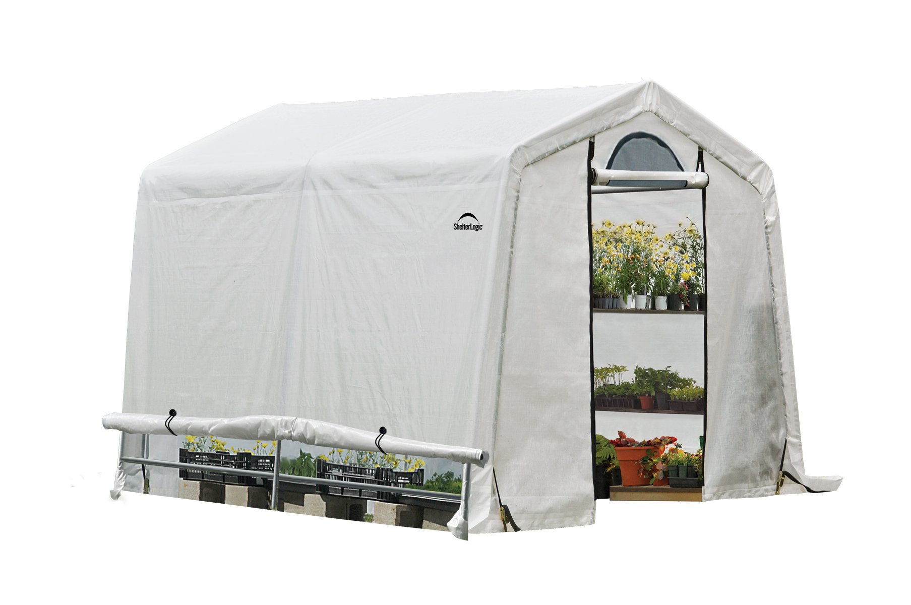 Foliengewächshaus Das mobile Gewächshaus ist schnell auf- und abbaubar und somit optimal für den saisonalen Gebrauch geeignet. Speziell Tomaten können in diesem Gewächshaus geschützt und sicher angezogen werden. Die hochwertige Polyethylene-Plane (160g/m²) ist UV-beständig und durch eine spezielle Versiegelung (keine Nähte) absolut wasserdicht. Ein 3,5cm massives und Premium beschichtetes Stahlgestell (3 Rippen) verhindert Rostbildung und garantiert eine hohe Lebensdauer. Patentierte Stabilisatoren (ShelterLogic® 3X Steel Stabilizers) gewährleisten eine 3x höhere Belastbarkeit der Konstruktion. Im Eingangsbereich ist eine Tür (BxH 100x210cm) mit 2 Reißverschlüssen sowie einem Fenster eingearbeitet. Für ausgewogene Luftzirkulation sorgt ein zweites Fenster an der Rückseite. Die Seitenwände lassen sich einfach aufrollen und durch Gummis befestigen, so das eine optimale Belüftung auch bei hohen Temperaturen im Sommer gewährleistet ist. Die 8 Stk. mitgelieferten Zurrgurte sichern die Festigkeit der Plane am Gestell bei Wind und Wetter. Im Lieferumfang sind 4 Stk. Bodenanker (38cm) zur festen Verankerung im Boden enthalten. Ein Fundament ist nicht erforderlich. In nur einer Box verpackt. – Breite: 240, – Gewicht: 34,8, – Höhe: 240, – Länge: 240, – Material: Stahl – PE-Plane