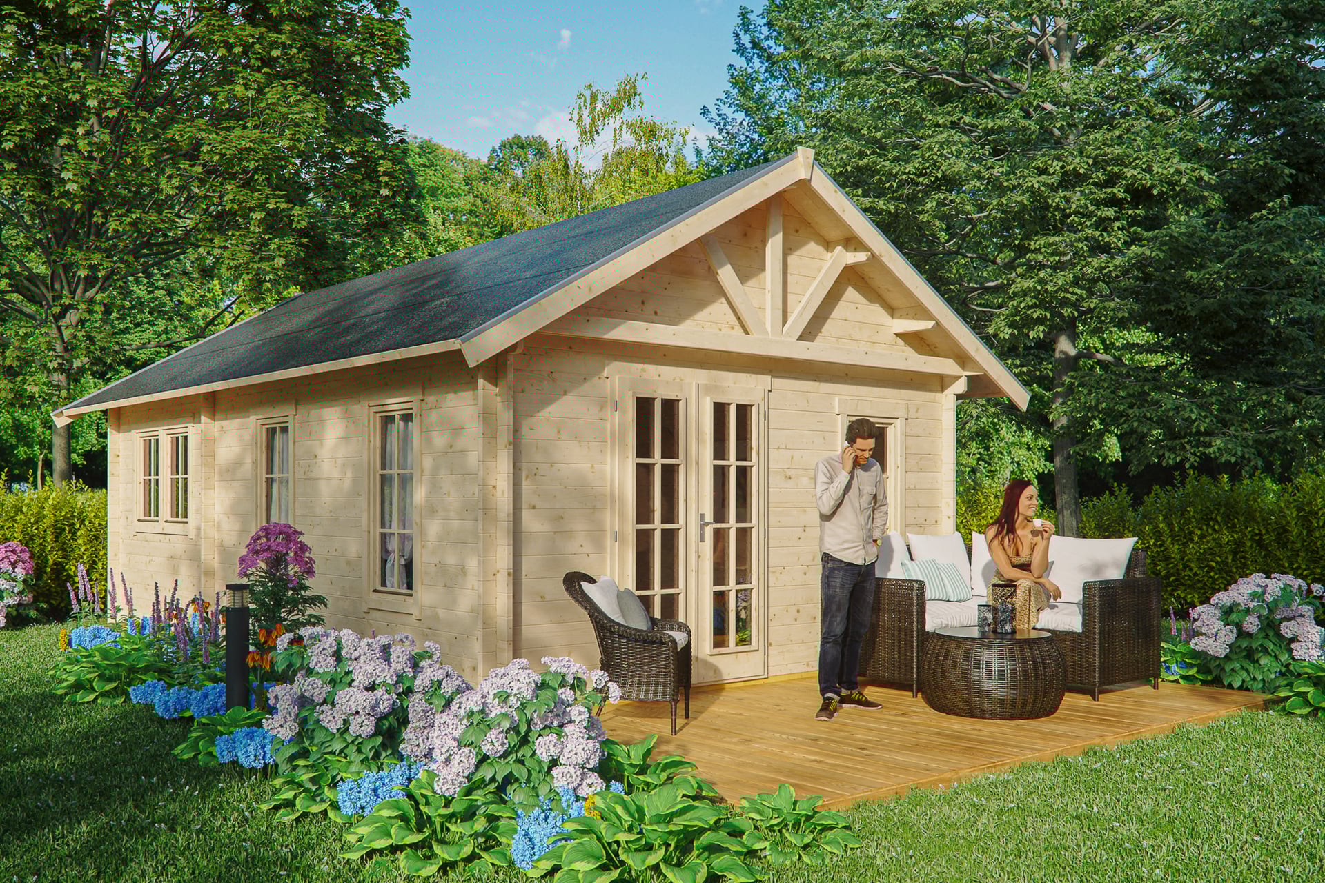 Konstruktion Die Konstruktion ist aus massiver nordischer Fichte gefertigt. Hier verwenden wir technisch getrocknetes, massives Fichtenholz, welches auf Fehler gescannt, sortiert und in der Länge nach wetterfest durch Keilzinken miteinander verleimt wurde. Kleinere Risse, Äste und leichte Verdrehungen spiegeln den Charakter der eingesetzten Materialien wider. Farbliche Behandlung Die Holzteile dieses Bausatzes sind farblich unbehandelt. Hölzer im Außenbereich sind der ständigen Witterung, sowie dem Risiko von Pilz- und Insektenbefall ausgesetzt. Daher ist ein regelmäßiger, allseitiger Schutzanstrich unbedingt erforderlich. Verwenden Sie zuerst Holzschutzgrund zum Schutz gegen Pilz- und Insektenbefall. Anschließend, gegen Verfärbung und Schäden durch UV-Licht, je eine Zwischen- und Schlussbeschichtung mit hochwertiger Holzschutzlasur oder -farbe. Die Montage erfolgt idealerweise zwischen dem ersten und zweiten Lasur- /Farbanstrich. Für den Aufbau müssen die Bohlen vom Anstrich getrocknet sein. Rechnen Sie mit Pflegeintervallen von ca. 4-5 Jahren, spätestens aber vor dem Eintreten sichtbarer Schäden. Beachten Sie dazu auch die Verarbeitungsrichtlinien des Lasurherstellers. Wände Alle 45 mm starken Wandbohlen haben eine Doppelnut- und Federfräsung. Die Bohlen werden einfach ineinander gesteckt. Die Passgenauigkeit der Bohlen beim Aufbau wird durch moderne Frästechnik und einer asymmetrischen Eckverbindung erreicht. Durch diese ist eine einfache Montage des Hauses gewährleistet. BASISHAUS, Dach nicht dämmbar: Das Dach wird mit 19 mm starker Profilschalung mit Nut und Feder zur Eindeckung mit Dachschindeln geliefert. (Dachschindeln sind als Zubehör optional bestellbar) Eine Lage Dachpappe ist im Lieferumfang enthalten. Fußboden Der Fußboden besteht aus unbehandelten 19 mm Holz-Dielen mit Nut und Feder inkl. imprägnierten Grundlagern.
