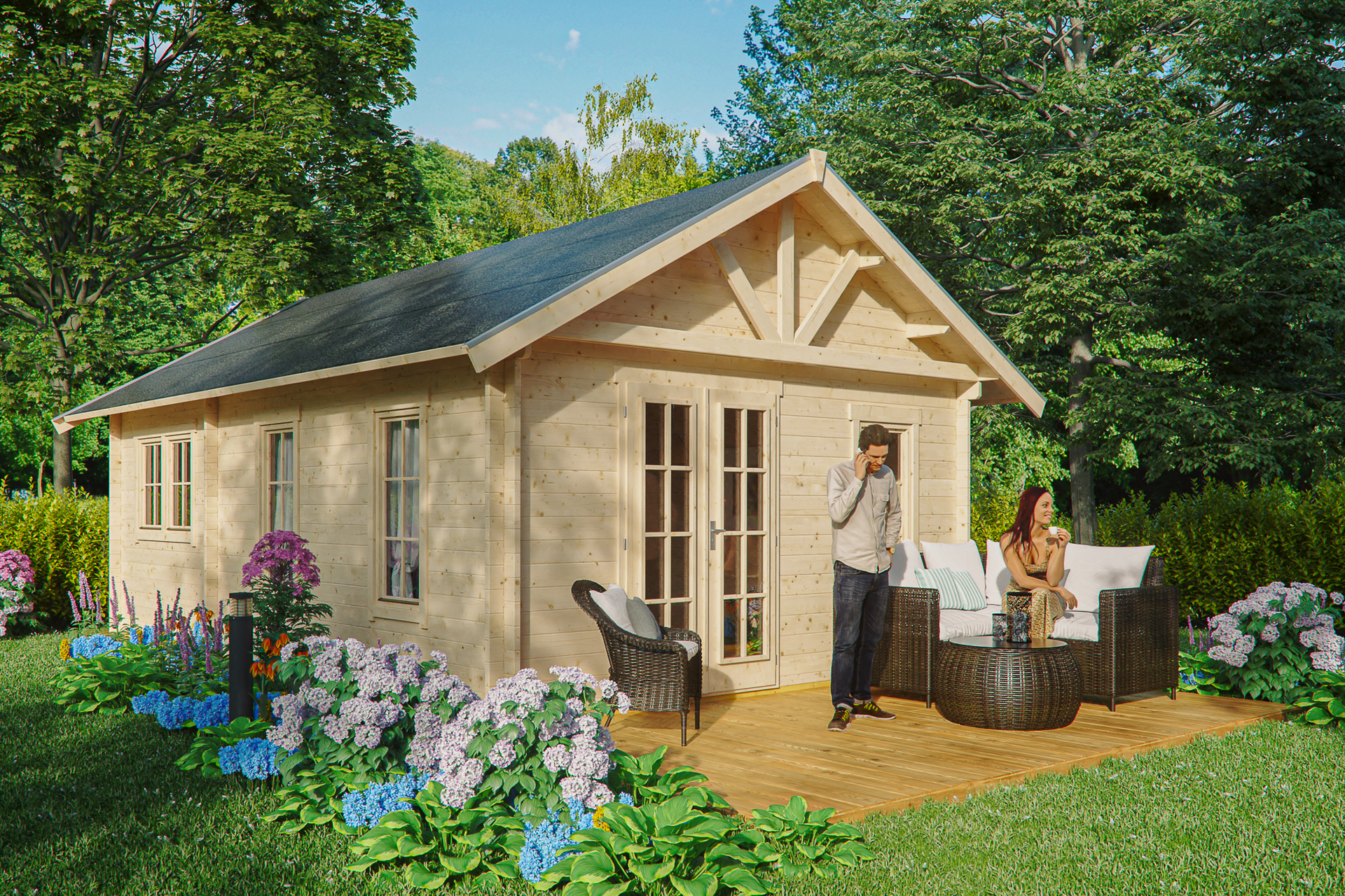 Konstruktion Die Konstruktion ist aus massiver nordischer Fichte gefertigt. Hier verwenden wir technisch getrocknetes, massives Fichtenholz, welches auf Fehler gescannt, sortiert und in der Länge nach wetterfest durch Keilzinken miteinander verleimt wurde. Kleinere Risse, Äste und leichte Verdrehungen spiegeln den Charakter der eingesetzten Materialien wider. Farbliche Behandlung Die Holzteile dieses Bausatzes sind farblich unbehandelt. Hölzer im Außenbereich sind der ständigen Witterung, sowie dem Risiko von Pilz- und Insektenbefall ausgesetzt. Daher ist ein regelmäßiger, allseitiger Schutzanstrich unbedingt erforderlich. Verwenden Sie zuerst Holzschutzgrund zum Schutz gegen Pilz- und Insektenbefall. Anschließend, gegen Verfärbung und Schäden durch UV-Licht, je eine Zwischen- und Schlussbeschichtung mit hochwertiger Holzschutzlasur oder -farbe. Die Montage erfolgt idealerweise zwischen dem ersten und zweiten Lasur- /Farbanstrich. Für den Aufbau müssen die Bohlen vom Anstrich getrocknet sein. Rechnen Sie mit Pflegeintervallen von ca. 4-5 Jahren, spätestens aber vor dem Eintreten sichtbarer Schäden. Beachten Sie dazu auch die Verarbeitungsrichtlinien des Lasurherstellers. Wände Alle 45 mm starken Wandbohlen haben eine Doppelnut- und Federfräsung. Die Bohlen werden einfach ineinander gesteckt. Die Passgenauigkeit der Bohlen beim Aufbau wird durch moderne Frästechnik und einer asymmetrischen Eckverbindung erreicht. Durch diese ist eine einfache Montage des Hauses gewährleistet. DACH DÄMMBAR, FÜR DACHSCHINDELN (Dämmdicke 60 mm): Dach aus 19 mm Profilschalung mit Nut und Feder, Konterlattung und 2. Schalung aus 19 mm Profilholz für die Eindeckung mit Dachschindeln, inkl. 1 Lage Dachpappe. Aluminiumschienen als Giebelabschluss. (Dachschindeln sind als Zubehör optional bestellbar) Fußboden Der Fußboden besteht aus unbehandelten 19 mm Holz-Dielen mit Nut und Feder inkl. imprägnierten Grundlagern.