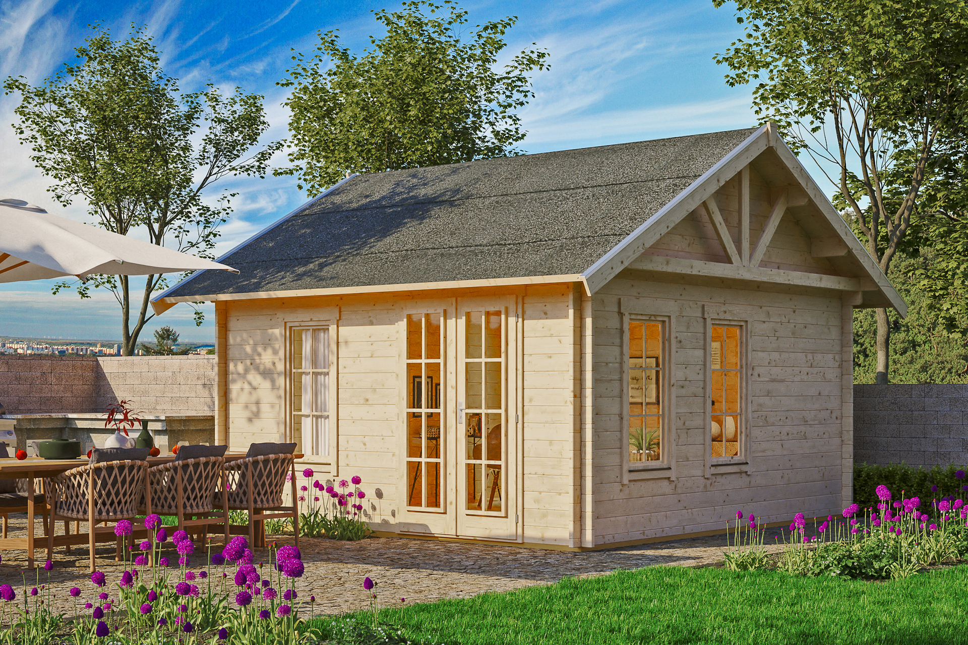 • Größe 420 x 420 cm • farblich unbehandelt • hochwertiges nordisches Fichtenholz • 4-seitig gehobelte 45 mm Wandbohlen mit Doppelnut und Feder • Chalet-Eckfräsungen und unsichtbaren Windverband • Fußboden 19 mm inkl. imprägnierten Grundlagern • Tür und Fenster mit Isolierglas und Gummidichtung sowie aufgesetztem Sprossenrahmen (Sprossenrahmen können wahlweise montiert oder weggelassen werden) • Tür mit Profilzylinderschloss und 3 Schlüsseln • Durchgangsmaß Tür B x H 112 x 181,5 cm • Fenster mit Aluminium-Abtropfkante und Dreh-Kipp-Beschlag • Dach 19 mm Profilschalung mit Nut und Feder sowie Aluminiumabschlusskante, inkl. 1 Lage Dachpappe zur Ersteindeckung • Dachschindeln als Zubehör erhältlich