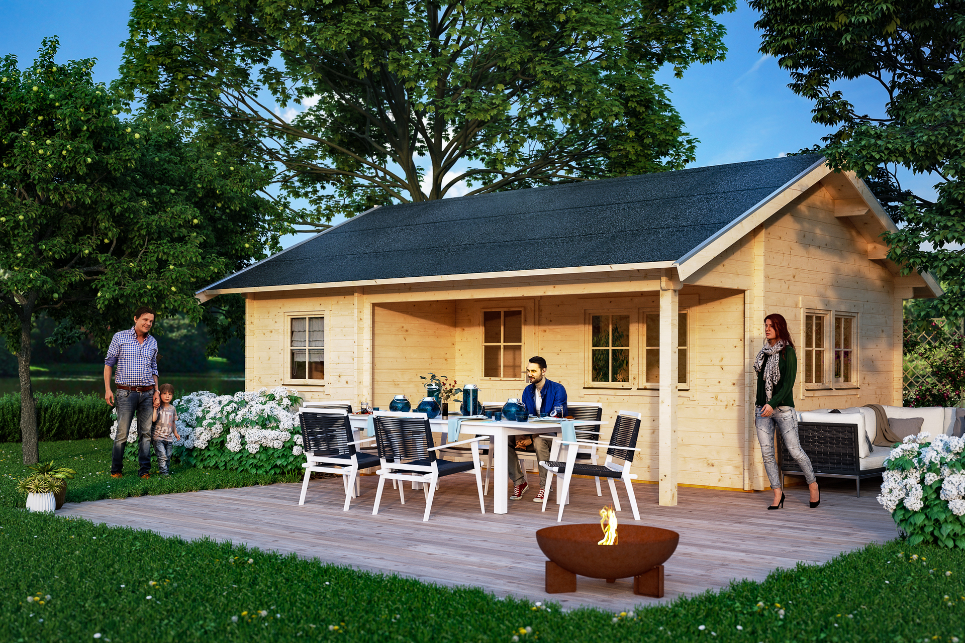 • Größe 600 x 500 cm • farblich unbehandelt • Haus mit 3 Räumen, überdachtem Eingangsbereich und Stauboden • hochwertiges nordisches Fichtenholz • 4-seitig gehobelte 45 mm Wandbohlen mit Doppelnut und Feder • Chalet-Eckfräsungen und unsichtbaren Windverband • Fußboden 19 mm inkl. imprägnierten Grundlagern • Außentür und Fenster mit Isolierglas und Gummidichtung sowie aufgesetztem Sprossenrahmen (Sprossenrahmen können wahlweise montiert oder weggelassen werden) • Tür mit Profilzylinderschloss und 3 Schlüsseln • Durchgangsmaß Tür B x H 78 x 181,5 cm • Durchgangsmaß Innentür(en) B x H 81 x 186 cm • Fenster mit Aluminium-Abtropfkante und Dreh-Kipp-Beschlag • Dach 19 mm Profilschalung mit Nut und Feder sowie Aluminiumabschlusskante, inkl. 1 Lage Dachpappe zur Ersteindeckung • Dachschindeln als Zubehör erhältlich