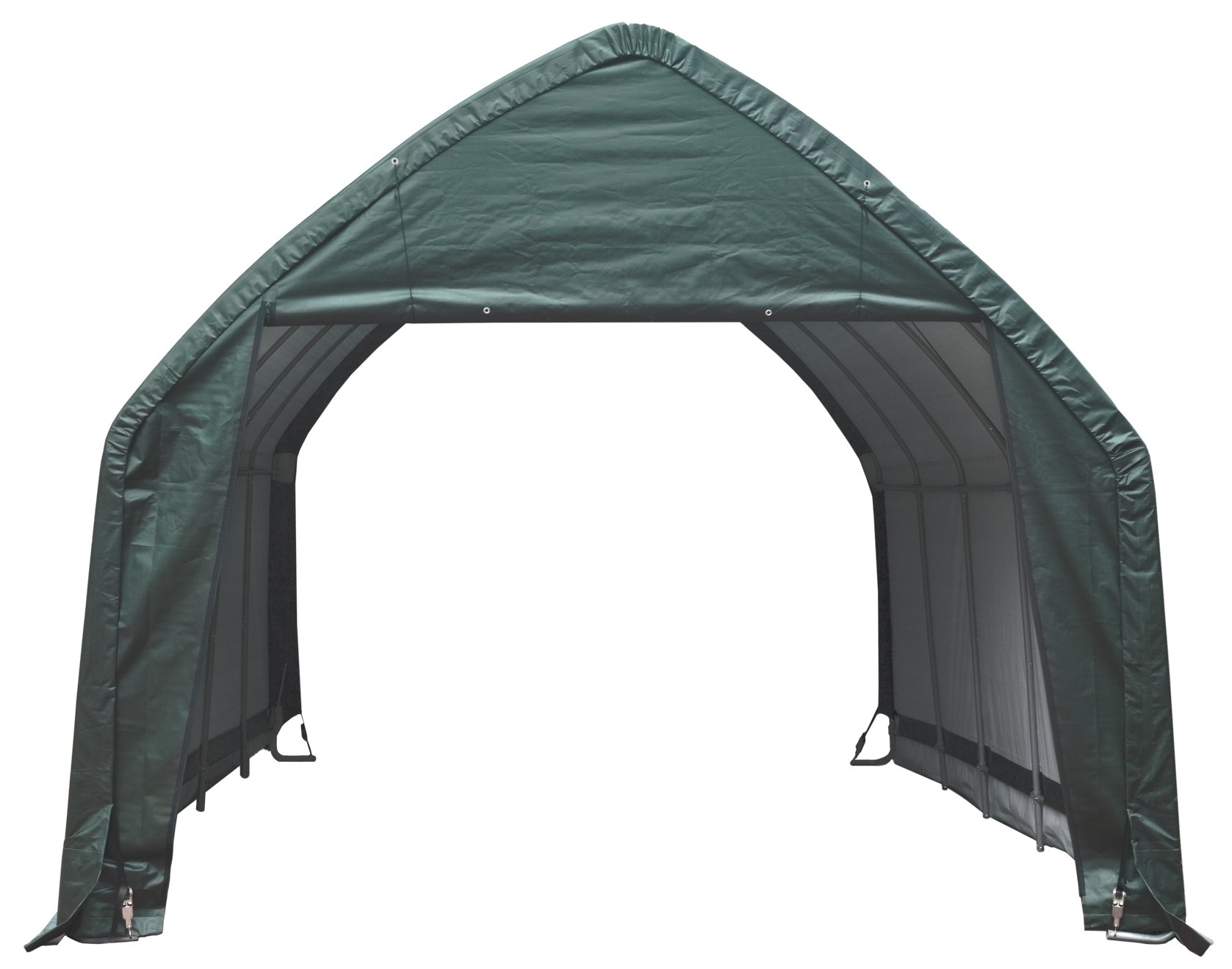 Garage-in-a-Box ShelterLogic Foliengarage Die ShelterLogic Foliengarage ist multifunktional einsetzbar und eignet sich bestens als Unterstellmöglichkeit für Autos, Motorräder, Anhänger oder Rasenmähertraktoren. Dank der einfachen Konstruktion aus Folie und Gestell lässt sich die Allzweck-Garage schnell auf- und abbauen und ist somit optimal für den saisonalen aber auch für den ganzjährigen Gebrauch geeignet. Die hochwertige, stabile Plane aus Polyethylen (210g/m²) ist UV-beständig und durch eine spezielle Versiegelung sowie eine nahtlose Verarbeitung absolut wasserdicht. Das 4,1cm starke, massive und zusätzlich Premium beschichtete Stahlgestell (5 Rippen) ist beständig gegen Rost und absolut witterungsbeständig. So ist eine hohe Lebensdauer garantiert. Patentierte Stabilisatoren (ShelterLogic® 3X Steel Stabilizers) gewährleisten eine 3x höhere Belastbarkeit der Konstruktion. In die Tür sind 2 Reißverschlüsse sowie und Befestigungs-Gummis eingearbeitet. Die verstärkte Rückwand sorgt für zusätzliche Stabilität. Die mitgelieferten Zurrgurte (8 Stück) sorgen für eine sichere Befestigung der Plane am Gestell. Ebenfalls im Lieferumfang enthalten sind 4 Sturmanker (38cm) zur festen Verankerung im Boden. Ein Fundament ist nicht erforderlich. – Breite: 390, – Gewicht: 150, – Höhe: 370, – Länge: 610, – Material: Stahl – PE-Plane