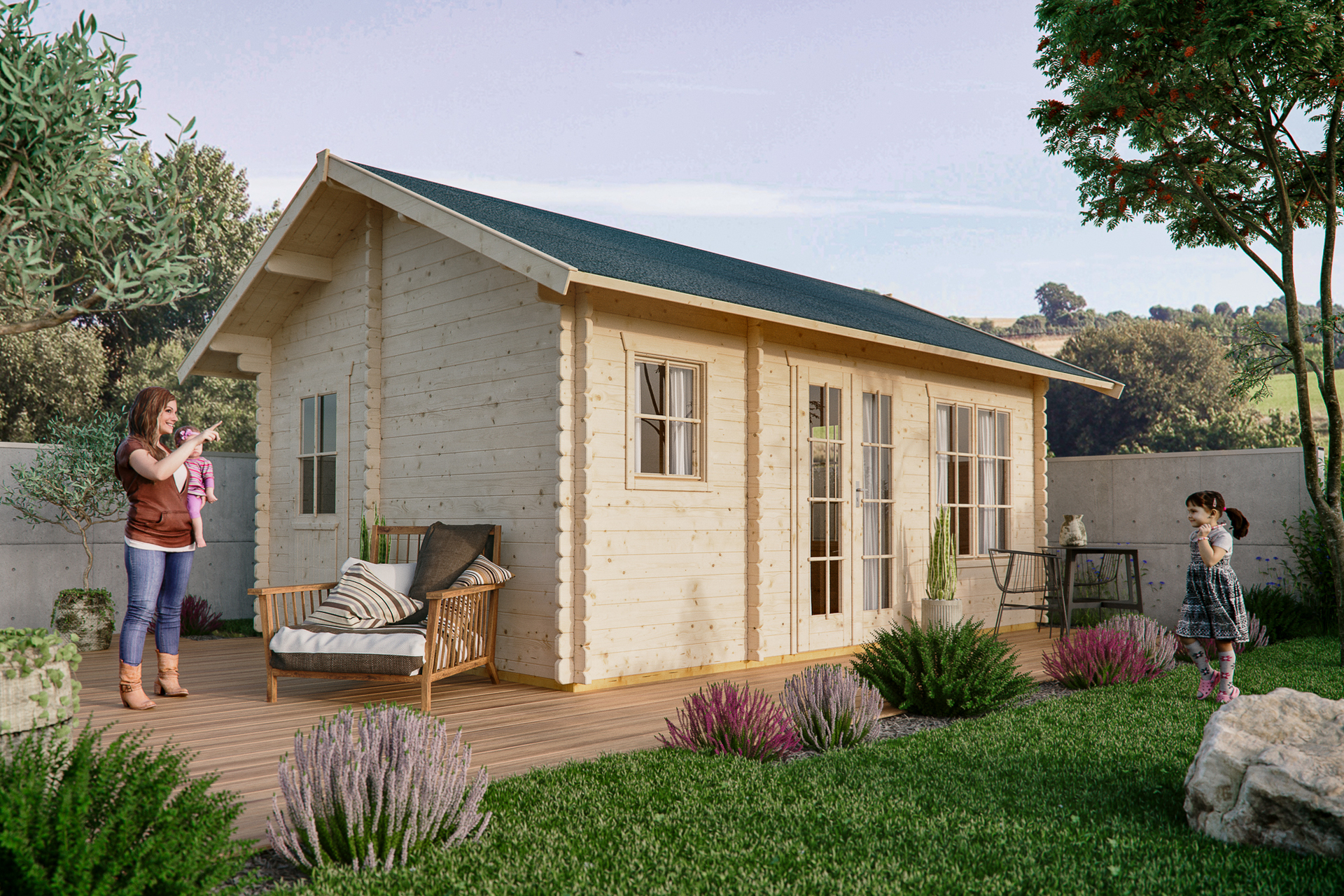 • Größe 380 x 520 cm • farblich unbehandelt • hochwertiges nordisches Fichtenholz • 4-seitig gehobelte 45 mm Wandbohlen mit Doppelnut und Feder • profilierte Eckverbindungen und unsichtbarer Windverband • Fußboden 19 mm inkl. imprägnierten Grundlagern • Tür und Fenster mit Echtglas und aufgesetzten Sprossen (Sprossenrahmen können wahlweise montiert oder weggelassen werden) • Tür mit Profilzylinderschloss und 3 Schlüsseln • Durchgangsmaß Tür B x H 117,5 x 186,5 cm • Fenster mit Dreh-Kipp-Beschlag • Dach 19 mm Profilschalung mit Nut und Feder inkl. 1 Lage Dachpappe zur Ersteindeckung • Dachschindeln als Zubehör erhältlich