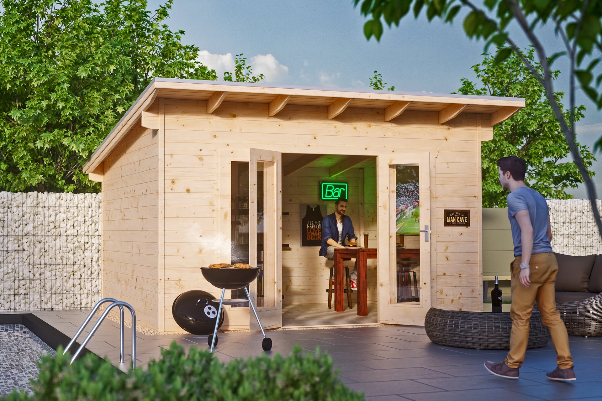 • Größe 400 x 300 cm • farblich unbehandelt • hochwertiges nordisches Fichtenholz • 4-seitig gehobelte 28 mm Wandbohlen mit Einfachnut und Feder • Steck-Schraub-Eckverbindung • Fußboden 19 mm inkl. imprägnierten Grundlagern • Tür und Fenster mit Echtglas • Tür mit Profilzylinderschloss und 3 Schlüsseln • Durchgangsmaß Tür B x H 123,4 x 193 cm • Die Panoramafenster sind feststehend, Glasscheibe durch Lösen von Schnappverschlüssen herausnehmbar • Dach 19 mm Profilschalung mit Nut und Feder sowie Aluminiumabschlusskante, inkl. 1 Lage Dachpappe zur Ersteindeckung • Aufgrund geringer Dachneigung Eindeckung mit Dachschindeln nicht möglich (KSK-M Dachbahnen sind optional als Zubehör erhältlich)