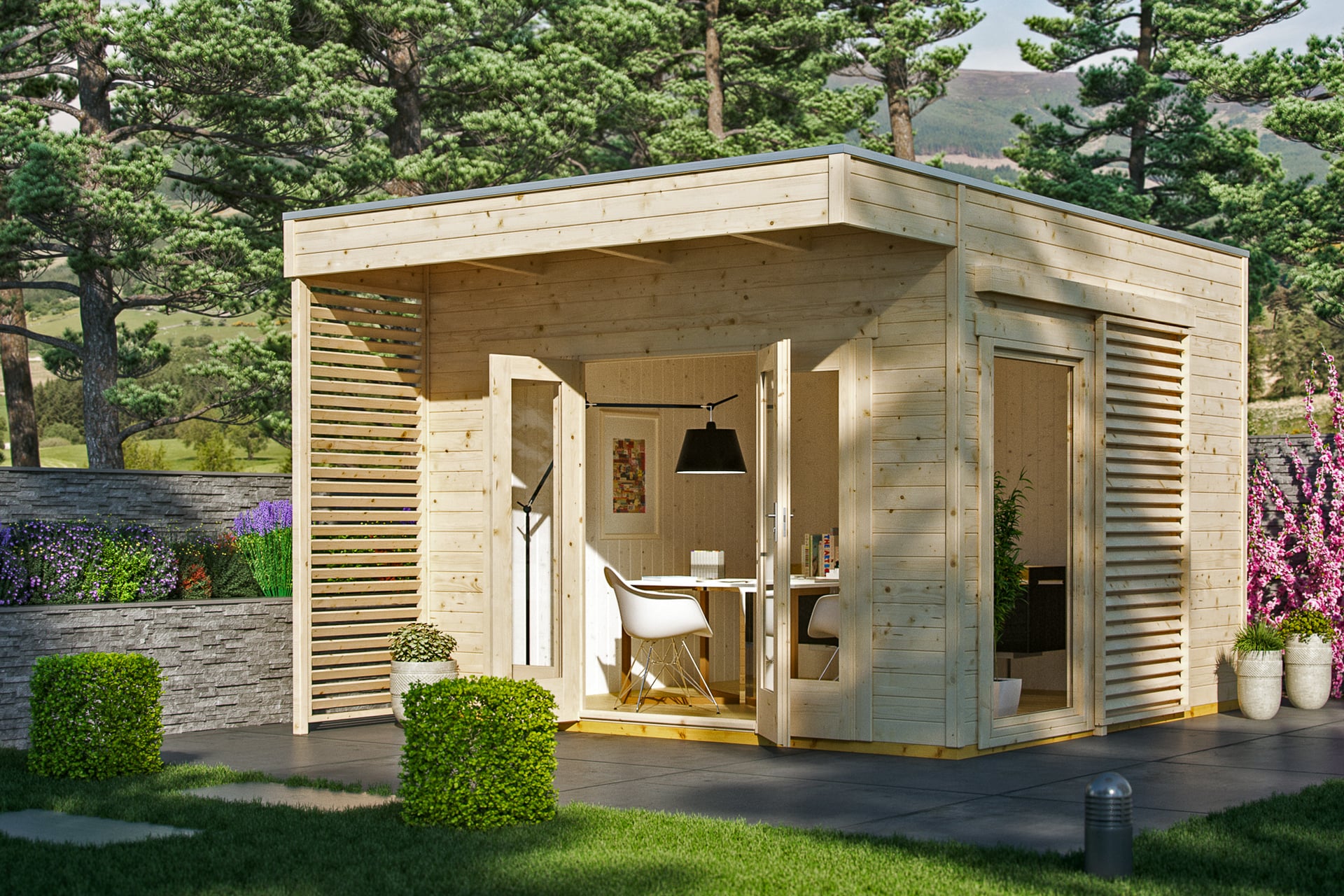 zwei Lamellenelemente, davon eins zum Verschieben, 19 mm Wandbohlen, Isoliermaterial für Dach und Wände, Innenwandverschalung 14 mm, Fußboden 19 mm inkl. imprägnierten Grundlagern, Tür und Fenster mit Isolierglas und Gummidichtung, 2 festestehende Fenster und ein Dreh-Kipp- Fenster, Dach 19 mm Profilschalung mit Aluminiumabschlusskante, inkl. selbstklebender KSK-M Dachbahn