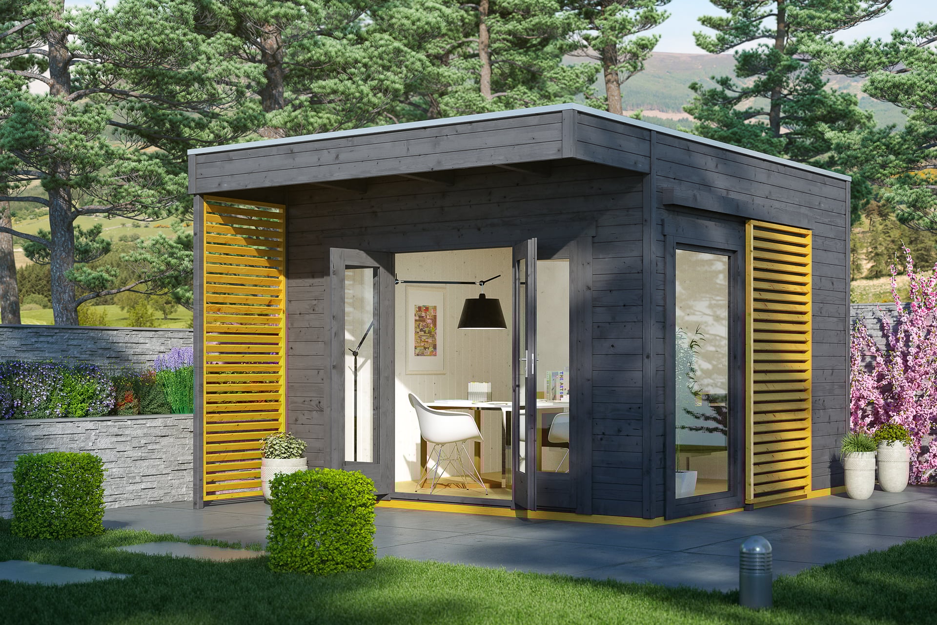 zwei Lamellenelemente, davon eins zum Verschieben, 19 mm Wandbohlen, Isoliermaterial für Dach und Wände, Innenwandverschalung 14 mm, Fußboden 19 mm inkl. imprägnierten Grundlagern, Tür und Fenster mit Isolierglas und Gummidichtung, 2 festestehende Fenster und ein Dreh-Kipp- Fenster, Dach 19 mm Profilschalung mit Aluminiumabschlusskante, inkl. selbstklebender KSK-M Dachbahn