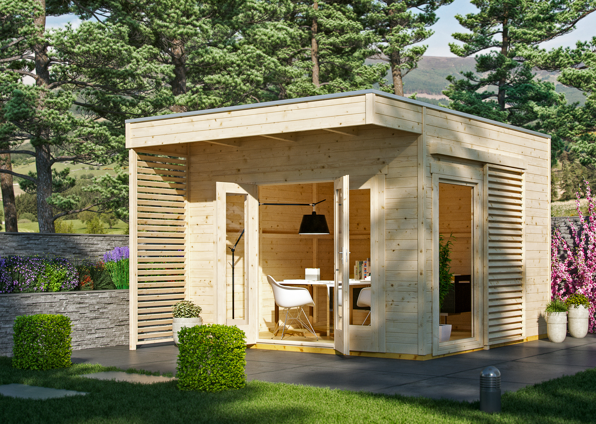 zwei Lamellenelemente, davon eins zum Verschieben, 19 mm Wandbohlen, Fußboden 19 mm inkl. imprägnierten Grundlagern, 1 Doppeltür, 2 festestehende Fenster ein Dreh-Kipp- Fenster, Dach 19 mm Profilschalung mit Aluminiumabschlusskante, inkl. selbstklebender KSK-M Dachbahn