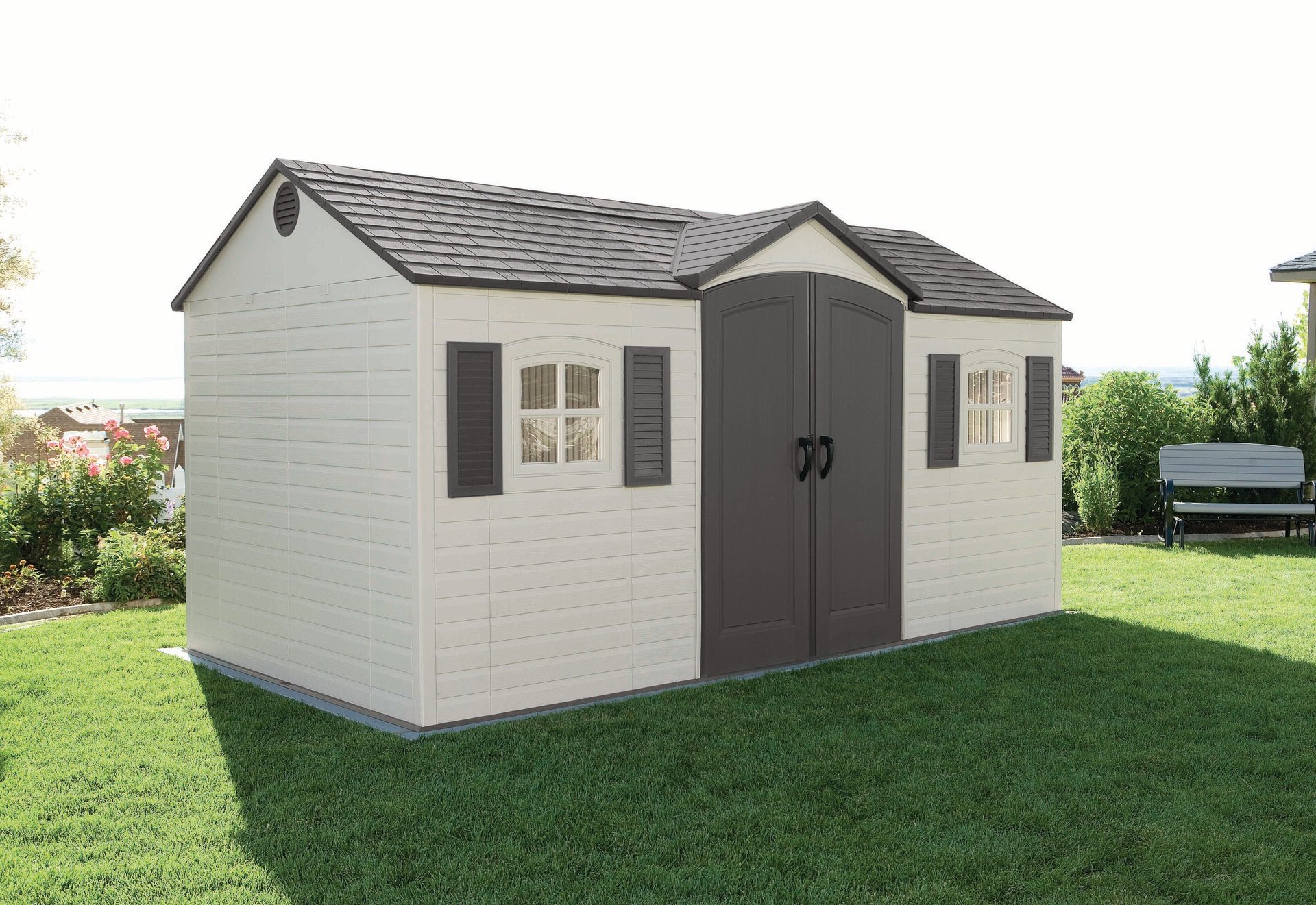 Gerätehaus Das stabilste Kunststoffgerätehaus auf dem Markt! Die hochqualitativen Gerätehäuser von Lifetime gelten als die stabilsten und langlebigsten Kunststoff-Gerätehäuser auf dem Markt — und das nicht ohne Grund: Seine enorme Stabilität erhält das Gerätehaus durch die Konstruktion aus doppelwandigem, metallverstärktem HDPE-Kunststoff (Hart-Polyethylen). Die Dachkonstruktion aus Hochleistungsstahl hält einer Traglast von bis zu 195 kg/m² Stand und die ideale Dachneigung von 23% ermöglicht zudem ein schnelles Ablaufen von Wasser und Schnee. Die robusten Lifetime-Gerätehäuser sind für den ganzjährigen Outdoor-Betrieb konstruiert und absolut wetterfest und UV-beständig. Die große Doppeltür ermöglicht einen einfachen Zugang und unkompliziertes Verstauen Ihrer Gerätschaften. Dank der glatten, lichtgrauen Wandoberfläche fügt sich das Gerätehaus natürlich und unaufdringlich in nahezu jeden Garten ein. Auch um die Wartung des Gerätehauses müssen Sie sich keine Gedanken machen: Der hochwertige Kunststoff ist äußerst pflegeleicht und wartungsfrei. – Breite: 457, – Gewicht: 314, – Höhe: 244, – Länge: 244, – Material: Kunststoff